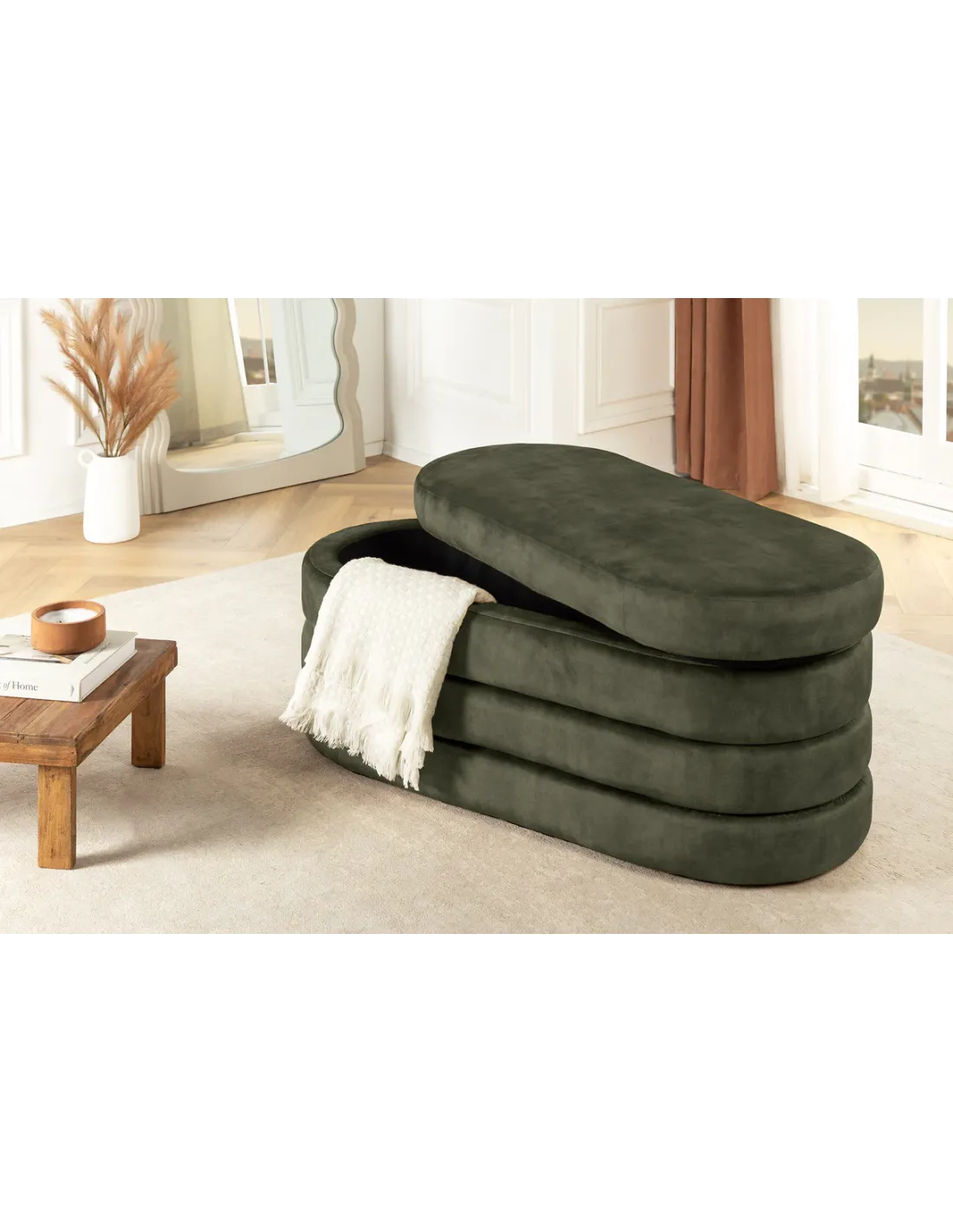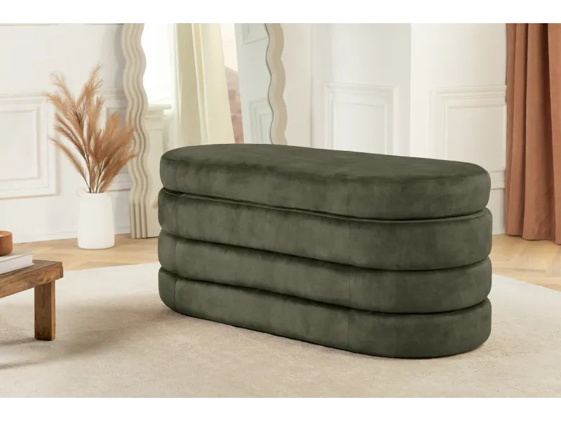 La banquette coffre VOQUE en velours vert combine style moderne, confort et rangement pratique. Elle est idéale pour optimiser vos espaces tout en apportant une touche décorative élégante et fonctionnelle dans le salon, la chambre ou l’entrée.