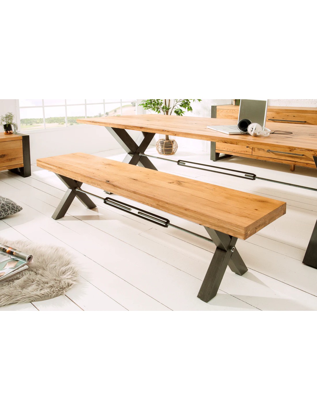 Le piètement en X, en métal noir poudré, confère au banc une allure industrielle affirmée et une stabilité à toute épreuve. Ce contraste entre le bois clair et le métal foncé souligne un style fort et contemporain, parfait pour les intérieurs modernes, lofts ou ambiances rustiques revisitées.