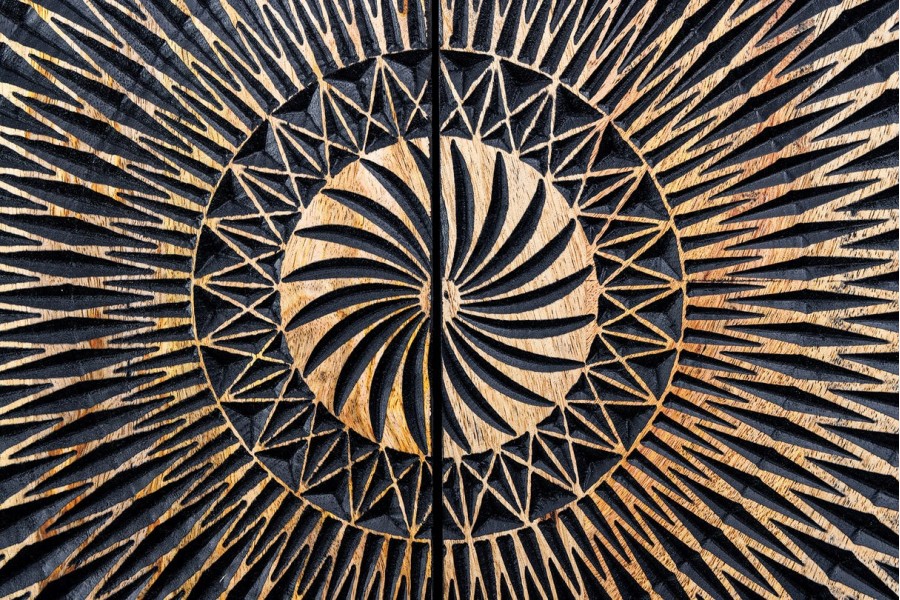 La façade en bois de manguier verni, travaillée en relief 3D, joue avec la lumière pour créer un rendu dynamique et original.