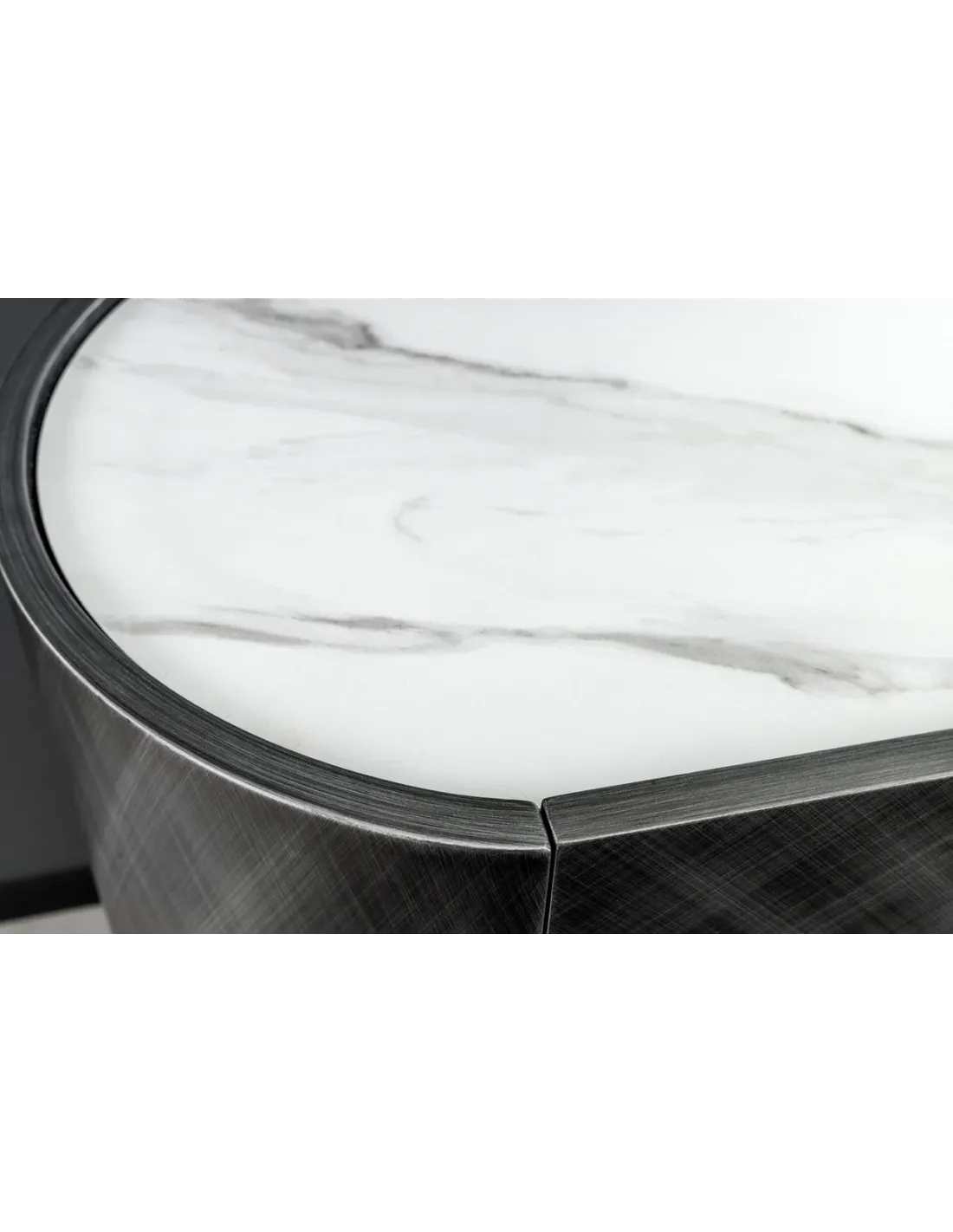 Design moderne et sophistiqué : façade effet 3D brossée en anthracite, plateau en céramique marbre blanc pour un style raffiné et contemporain.