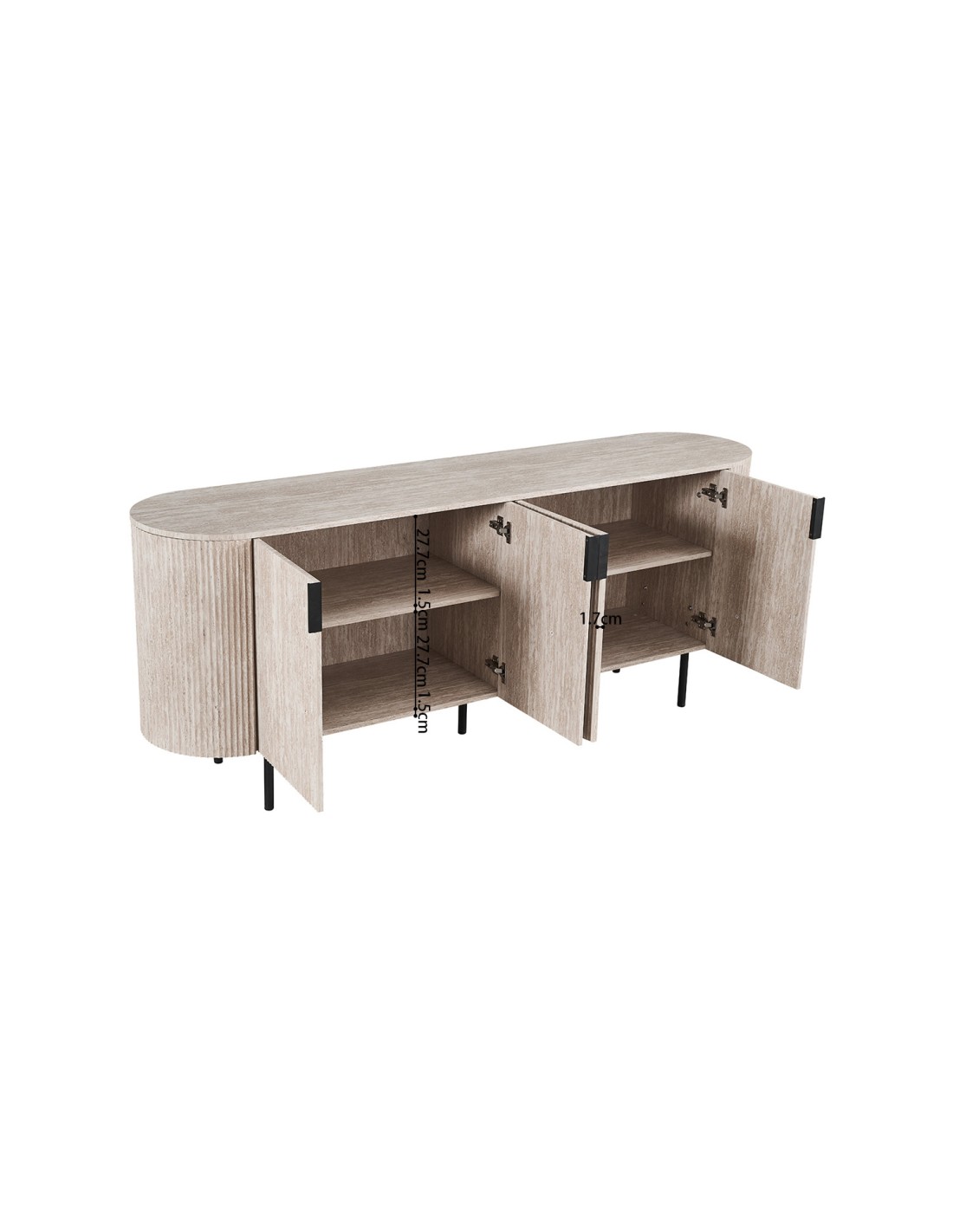 Ce buffet est fabriqué en MDF recouvert d’un décor papier imprimé et imprégné de résine, pressé sous haute pression pour offrir une surface lisse, esthétique et facile à entretenir.
