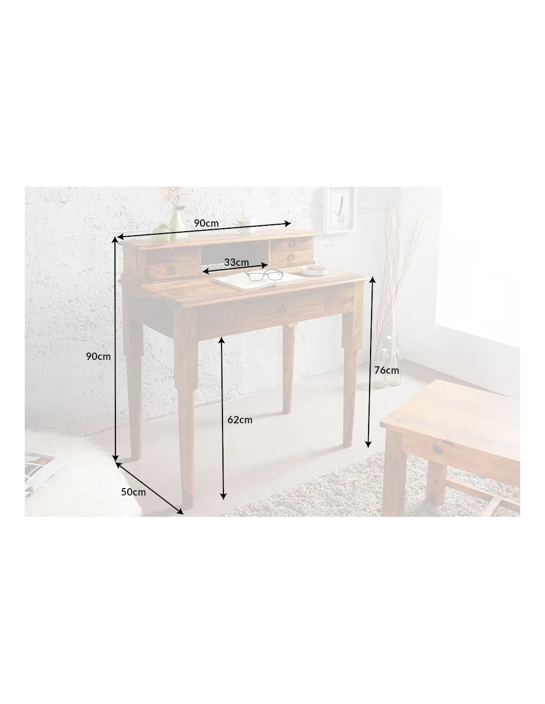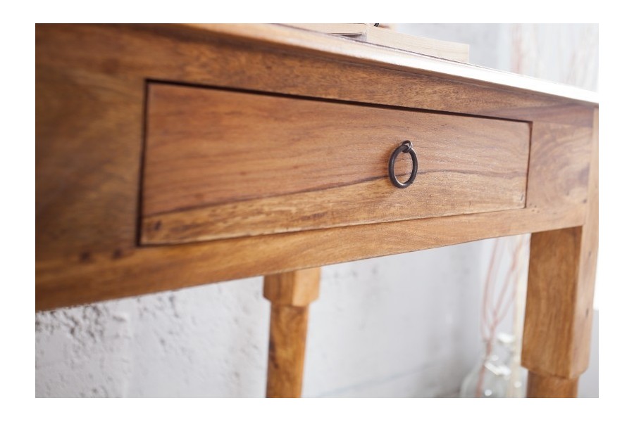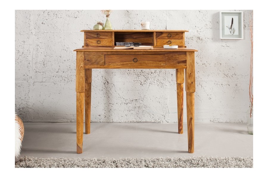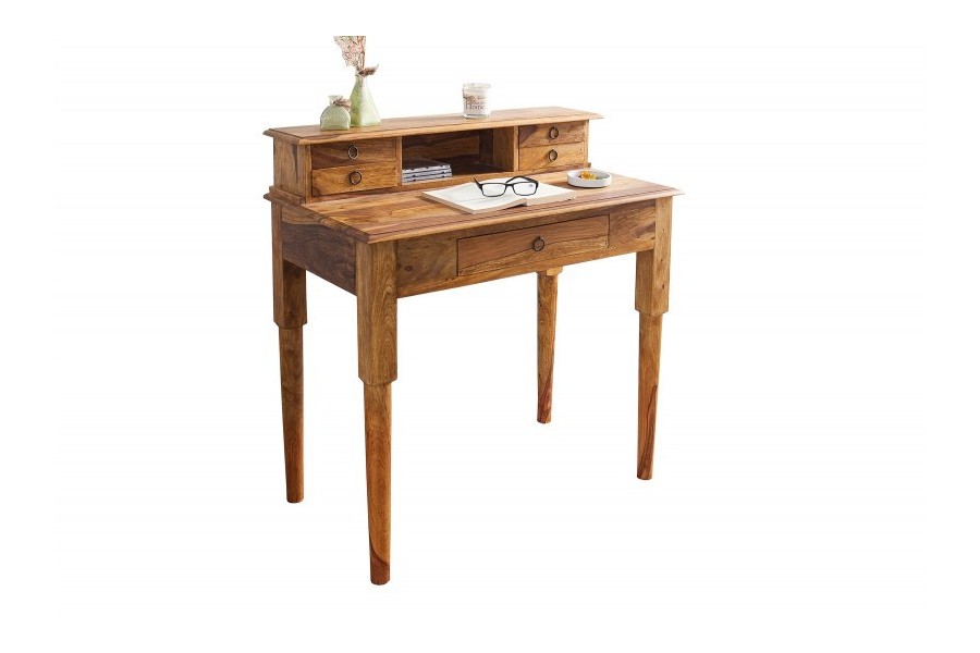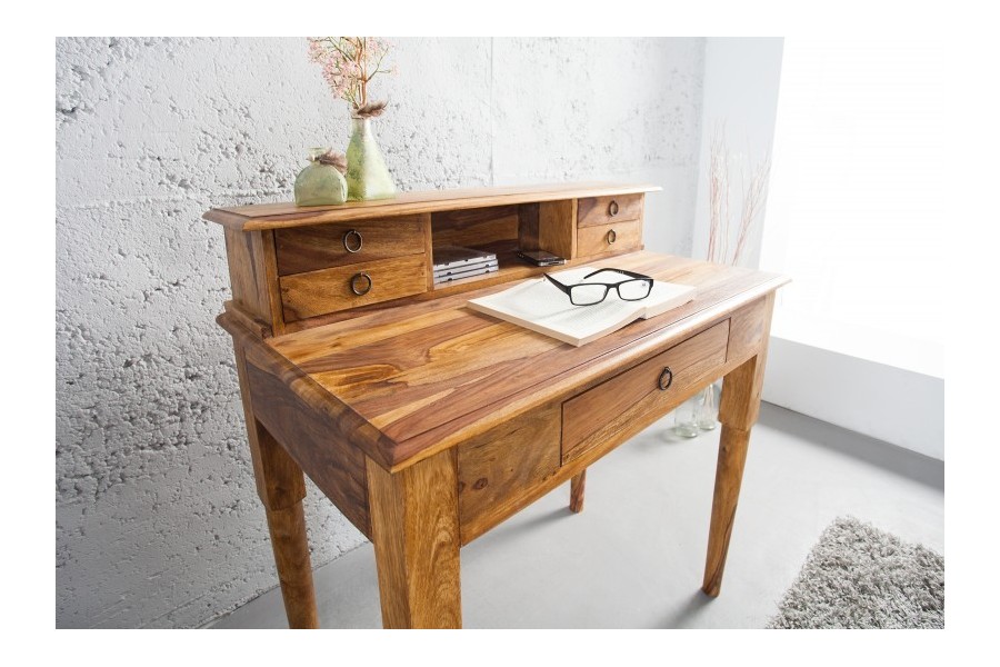Le sheesham, également appelé palissandre indien, est reconnu pour sa robustesse et ses motifs veinés spectaculaires. Chaque bureau est une pièce unique, où le naturel du bois est sublimé par un vernis protecteur qui facilite l’entretien et garantit une longue durée de vie.