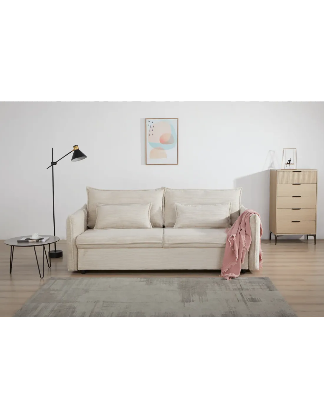 Avec son tissu cordon beige élégant et intemporel, ce canapé-lit séduit par sa polyvalence et son design raffiné. Parfait pour les moments de détente comme pour héberger vos invités, il combine confort quotidien, praticité et esthétisme pour sublimer votre salon.