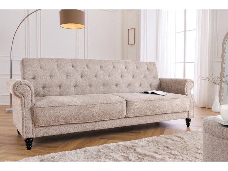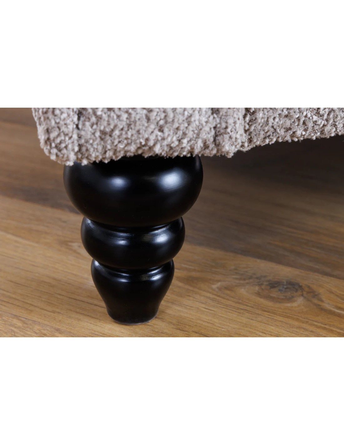 Son revêtement bouclé grège au toucher doux et chaleureux, ses accoudoirs courbés, ses coutures décoratives et ses pieds en bois d’hévéa foncé en font une pièce maîtresse de votre salon.