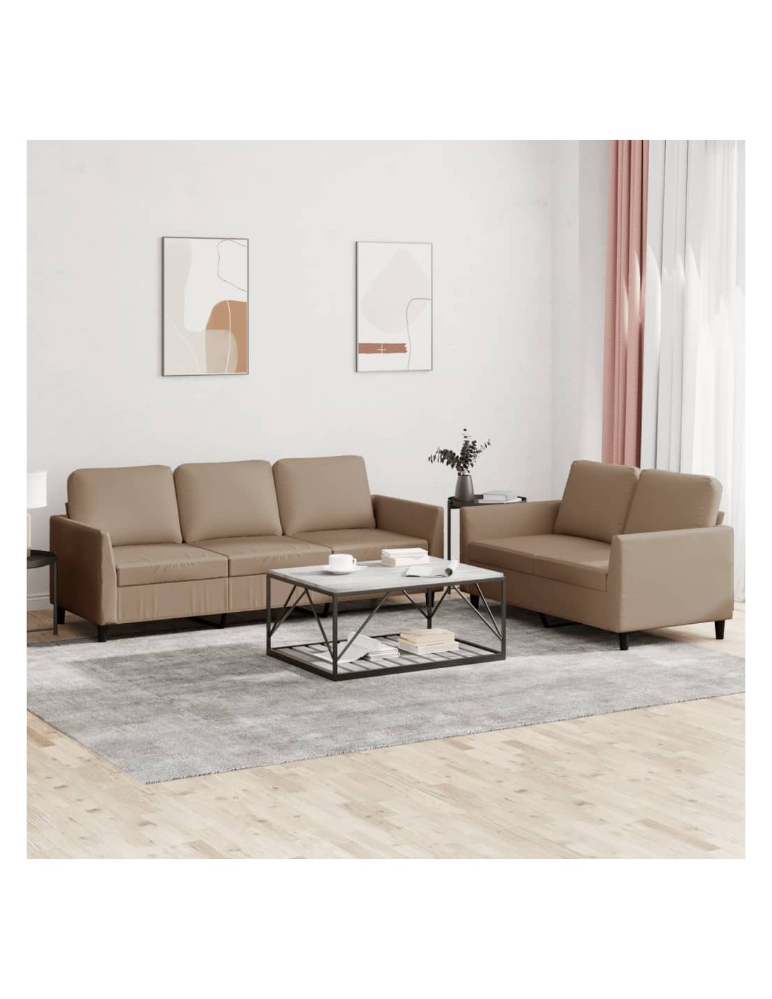 Cet ensemble de canapés est un excellent endroit pour discuter, lire, regarder la télévision ou simplement vous détendre. Il est destiné à être un point central de votre maison. Similicuir durable : le similicuir de qualité supérieure est un matériau très durable. Il est résistant aux taches, ce qui le rend facile à nettoyer avec un chiffon humide. La surface lisse donne également un aspect luxueux et la beauté du cuir véritable.Structure robuste et stable : la structure en contreplaqué et en métal du canapé assure robustesse et stabilité. Expérience d'assise confortable : le canapé est très confortable avec le siège, les accoudoirs et les oreillers de dossier bien rembourrés.