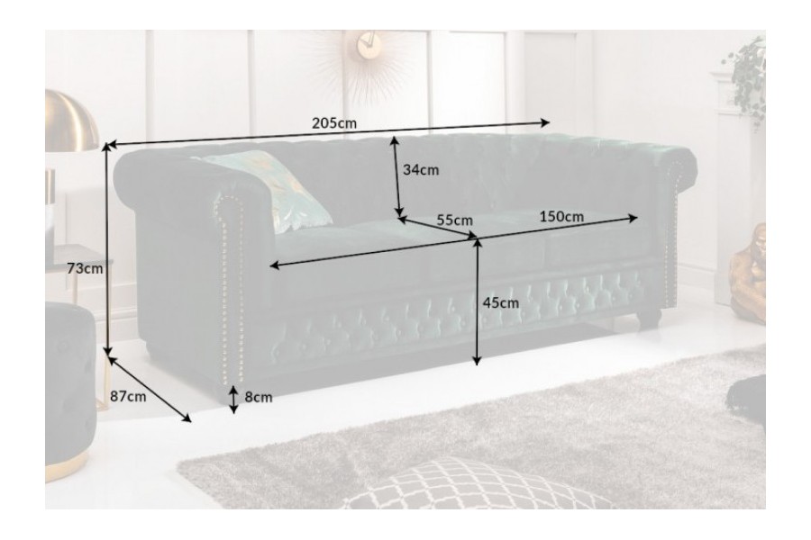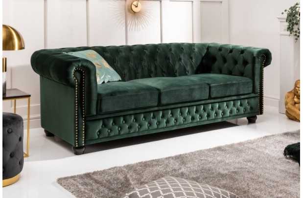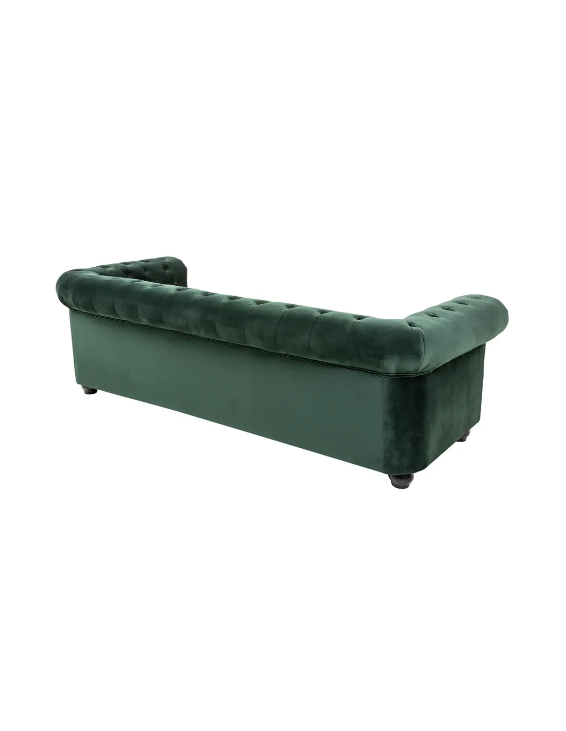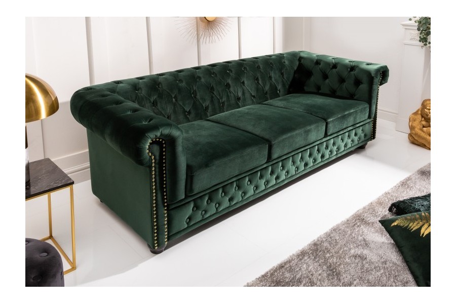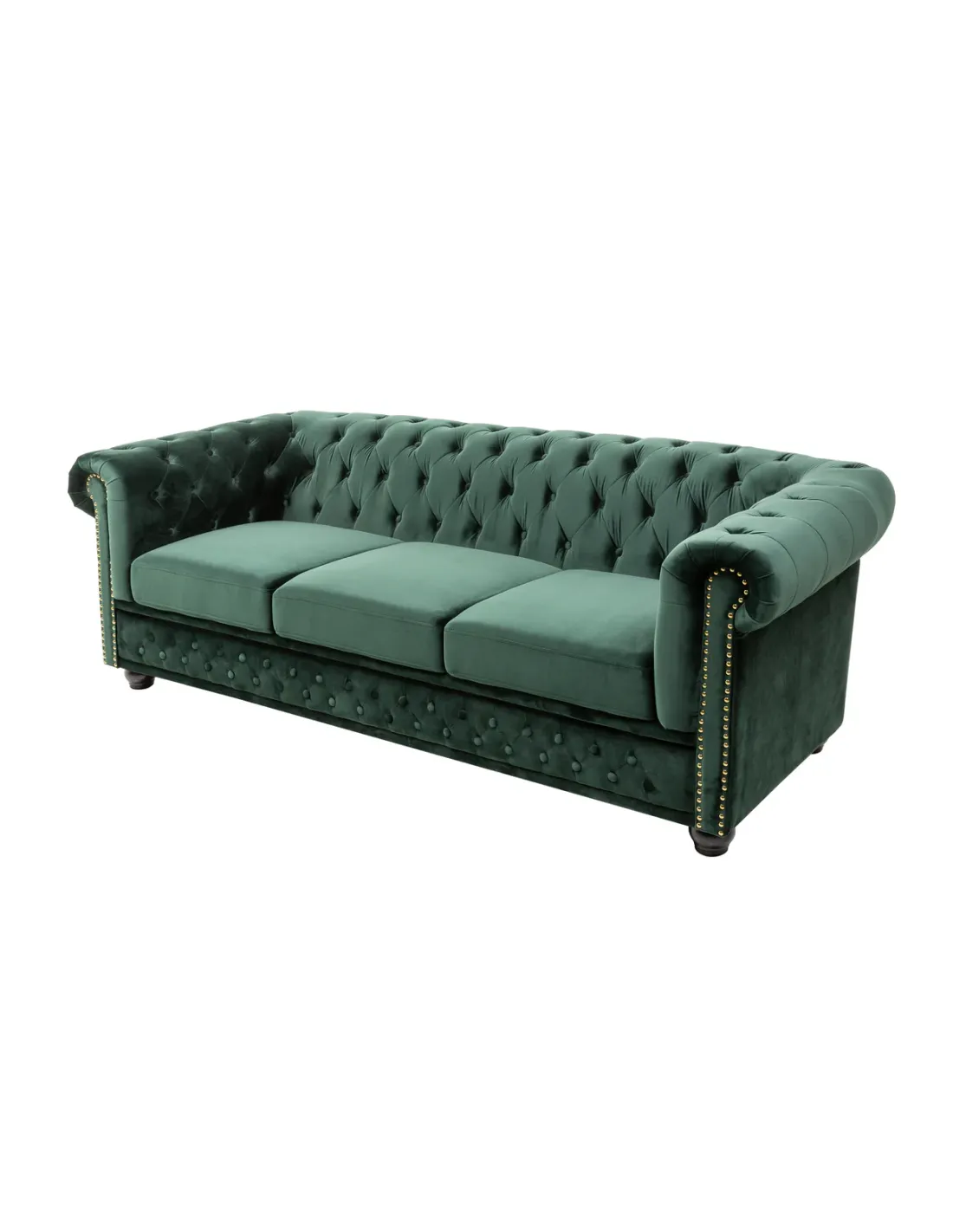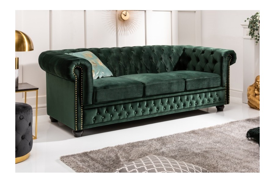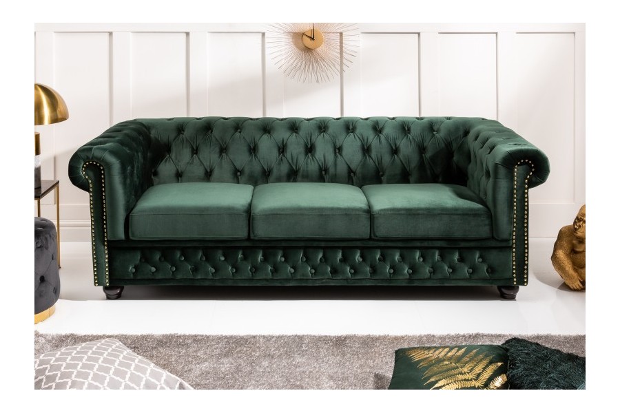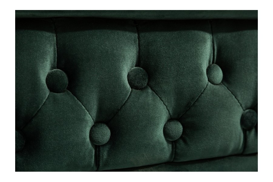 Offrez à votre salon une atmosphère sophistiquée et chaleureuse avec le canapé CHESTERFIELD 3 places en velours vert émeraude, une alliance parfaite entre tradition et élégance moderne.