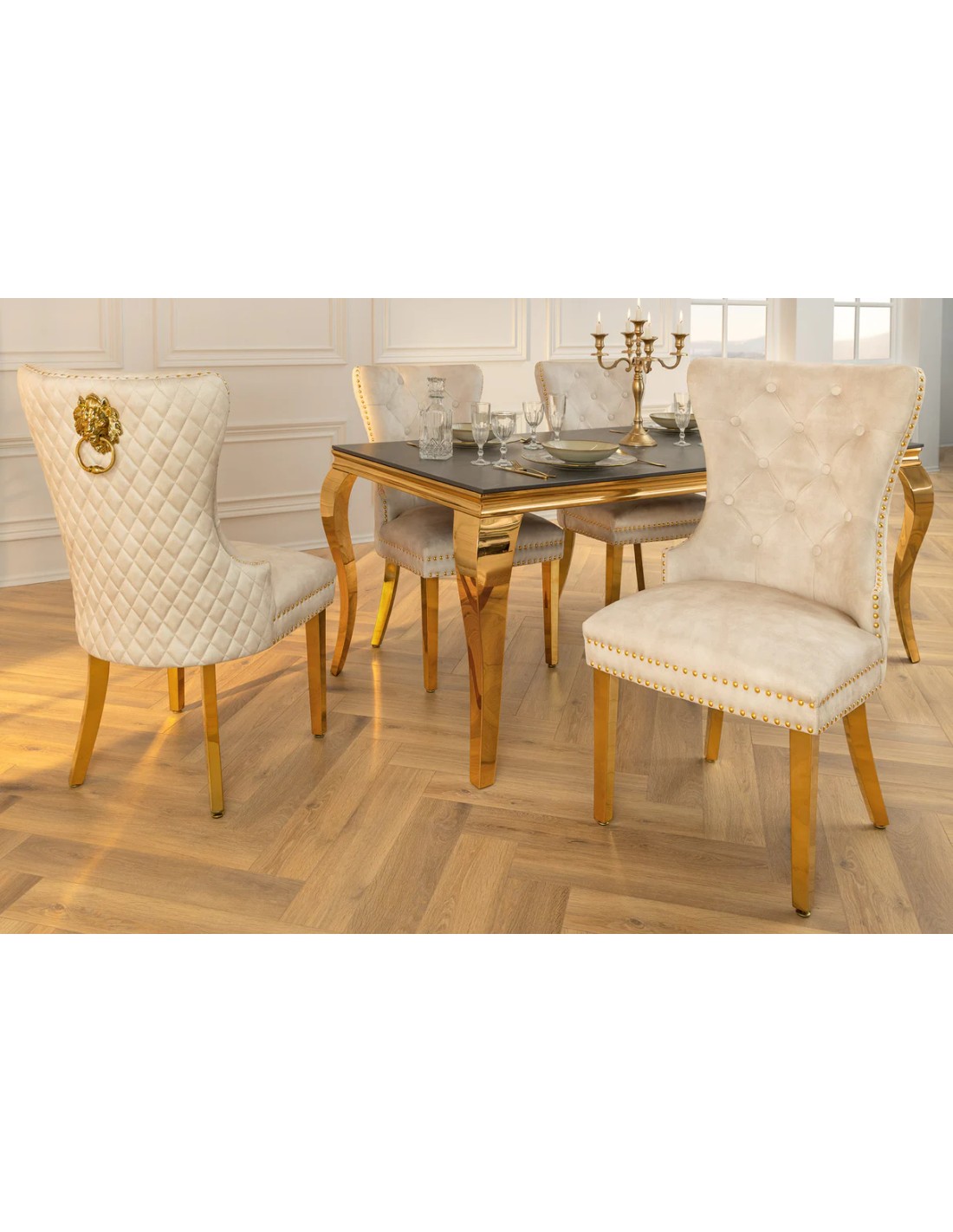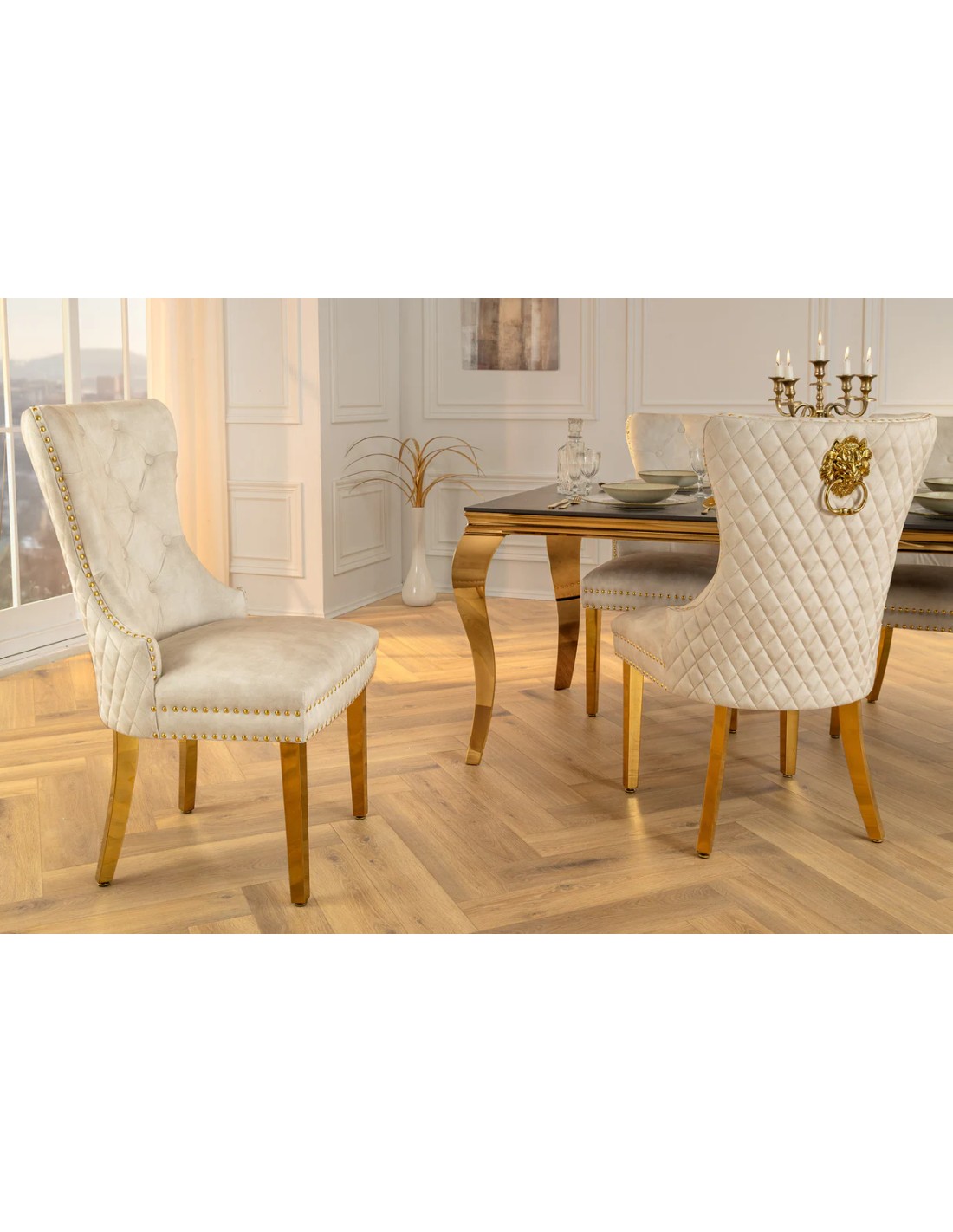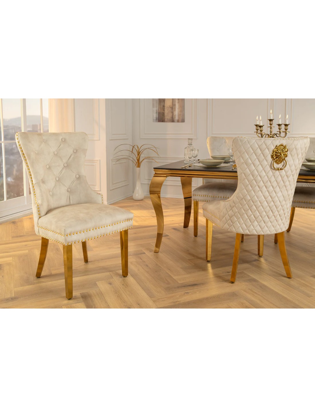 Les chaises CASTLE sont une déclaration de style : leur dossier capitonné orné d’une tête de lion dorée évoque la noblesse et le prestige du mobilier royal.