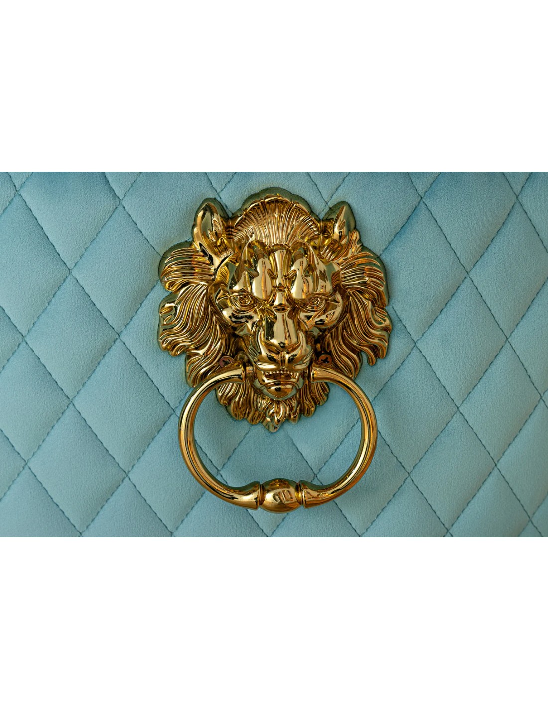 Son dossier orné d’une poignée sculptée en tête de lion, emblème de puissance et de prestige, contraste avec la douceur du velours bleu clair pour un rendu à la fois noble et lumineux.