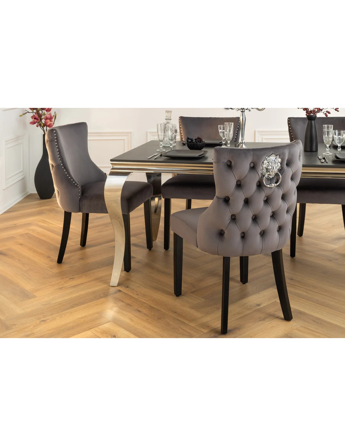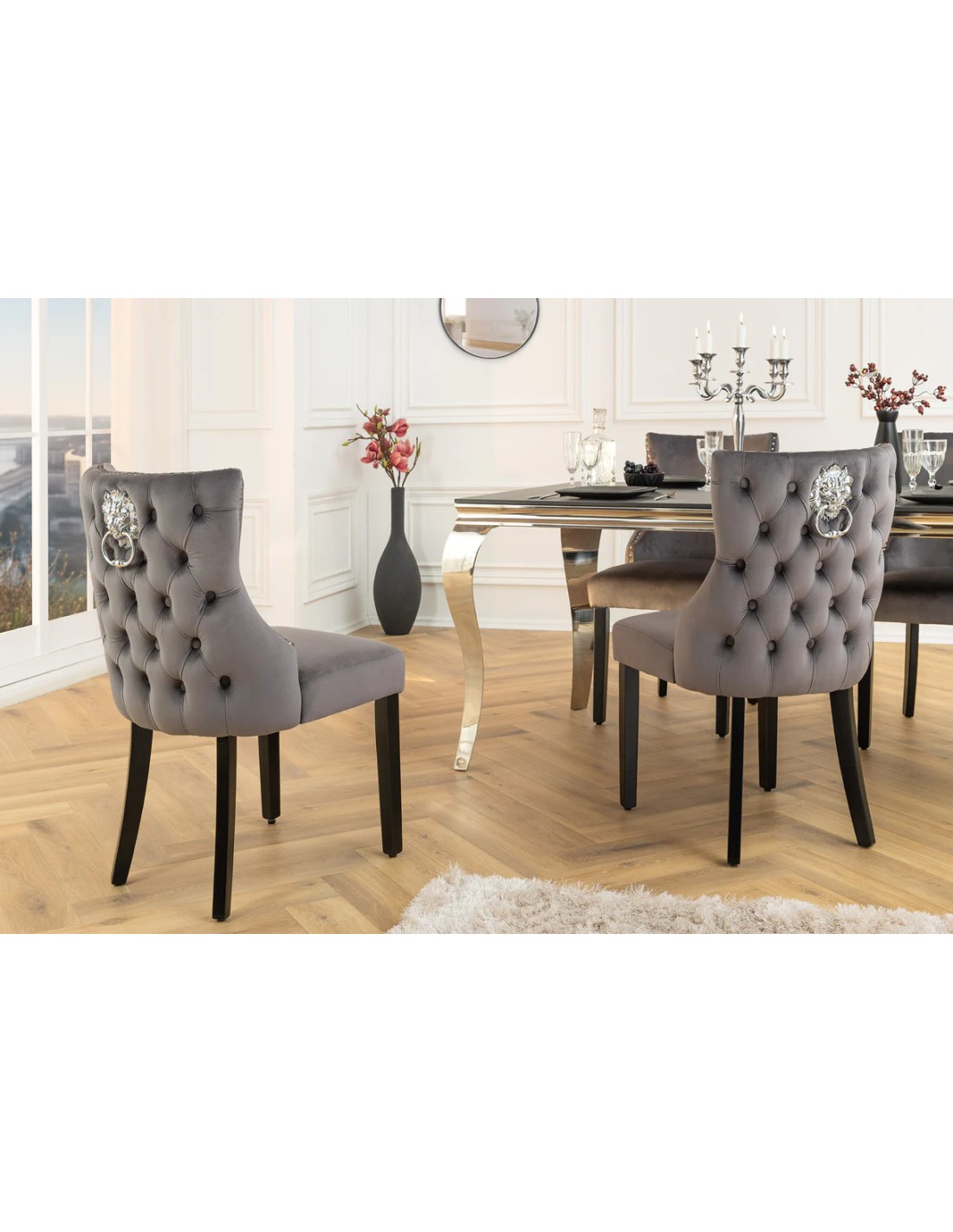 La poignée décorative en tête de lion argentée, en plus de son attrait esthétique, permet de déplacer facilement la chaise.
