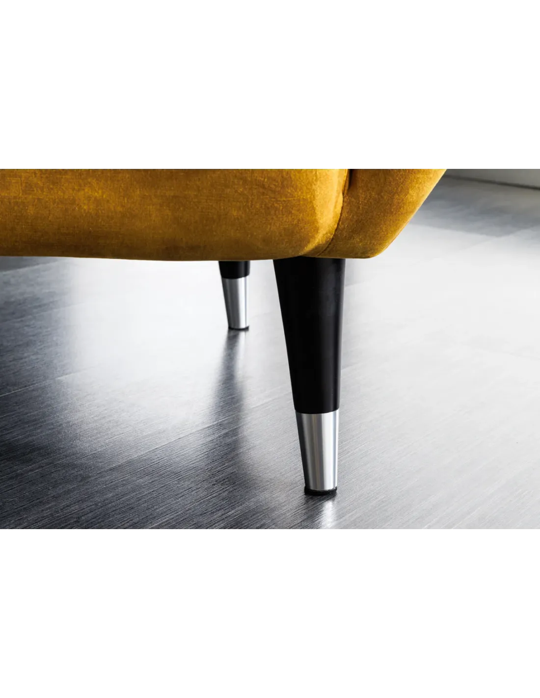 Finitions élégantes : pieds noirs avec embouts argentés, détail chic et contemporain.