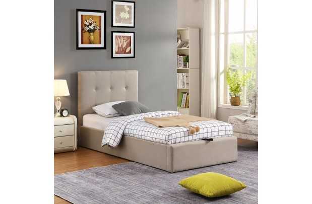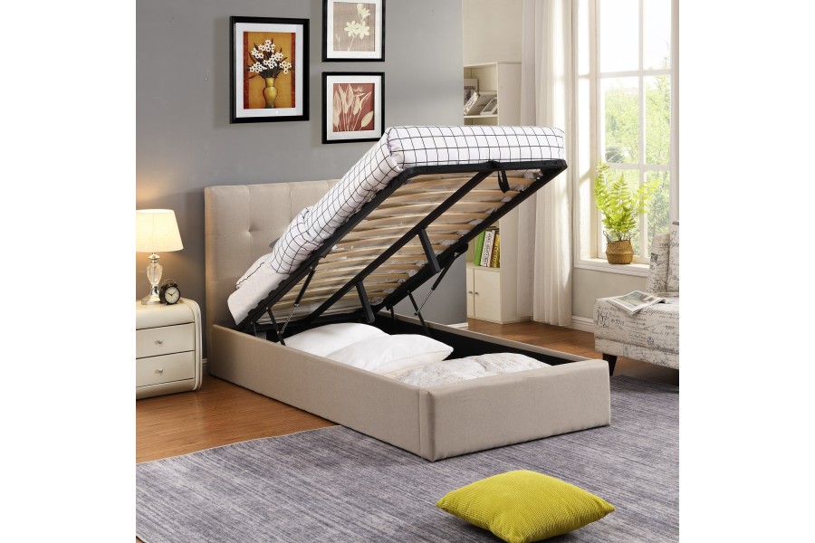 Son tissu en lin beige ignifuge apporte une touche naturelle et chaleureuse, tandis que son grand coffre intégré vous aide à optimiser votre espace de vie.