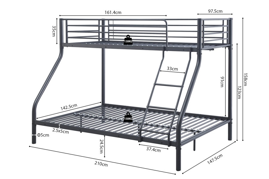 Ce lit est conçu pour accueillir un couchage double (140x200) en partie basse et un couchage simple (90x200) à l’étage. Il offre ainsi trois places confortables, parfaites pour les familles, les chambres d’enfants ou les locations de vacances. Sa conception métallique assure une bonne aération des matelas et un entretien facile, tout en offrant un couchage stable et résistant dans le temps.