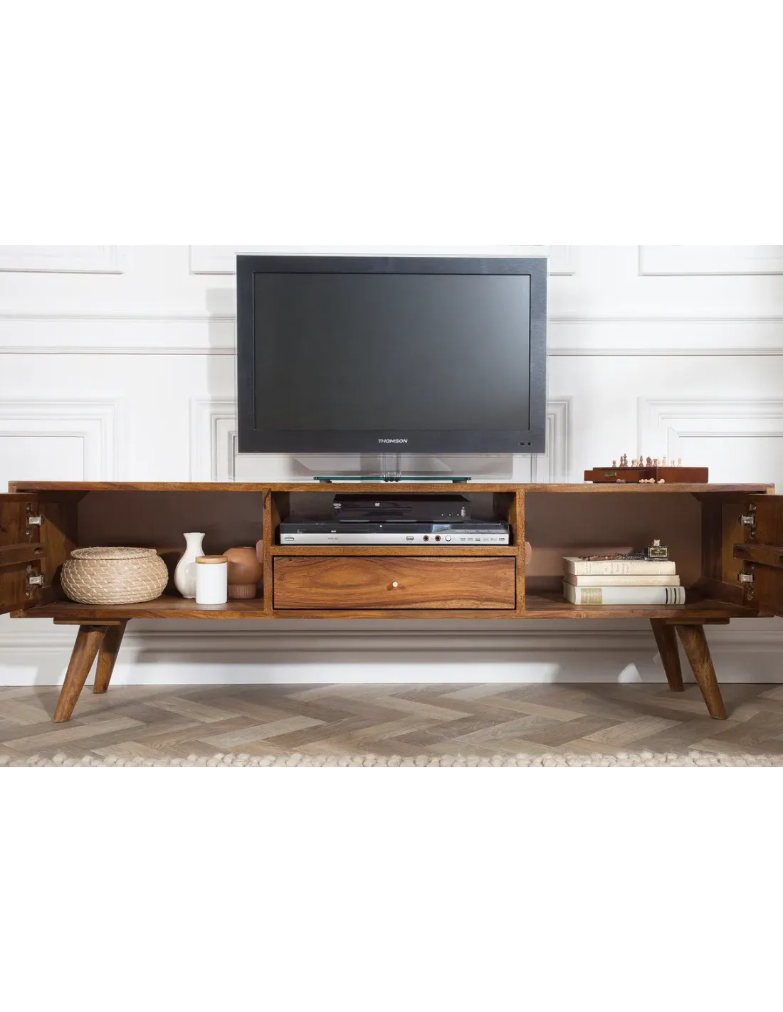 Ce meuble TV bois massif avec compartiments offre un rangement fonctionnel tout en mettant en valeur votre espace de divertissement.