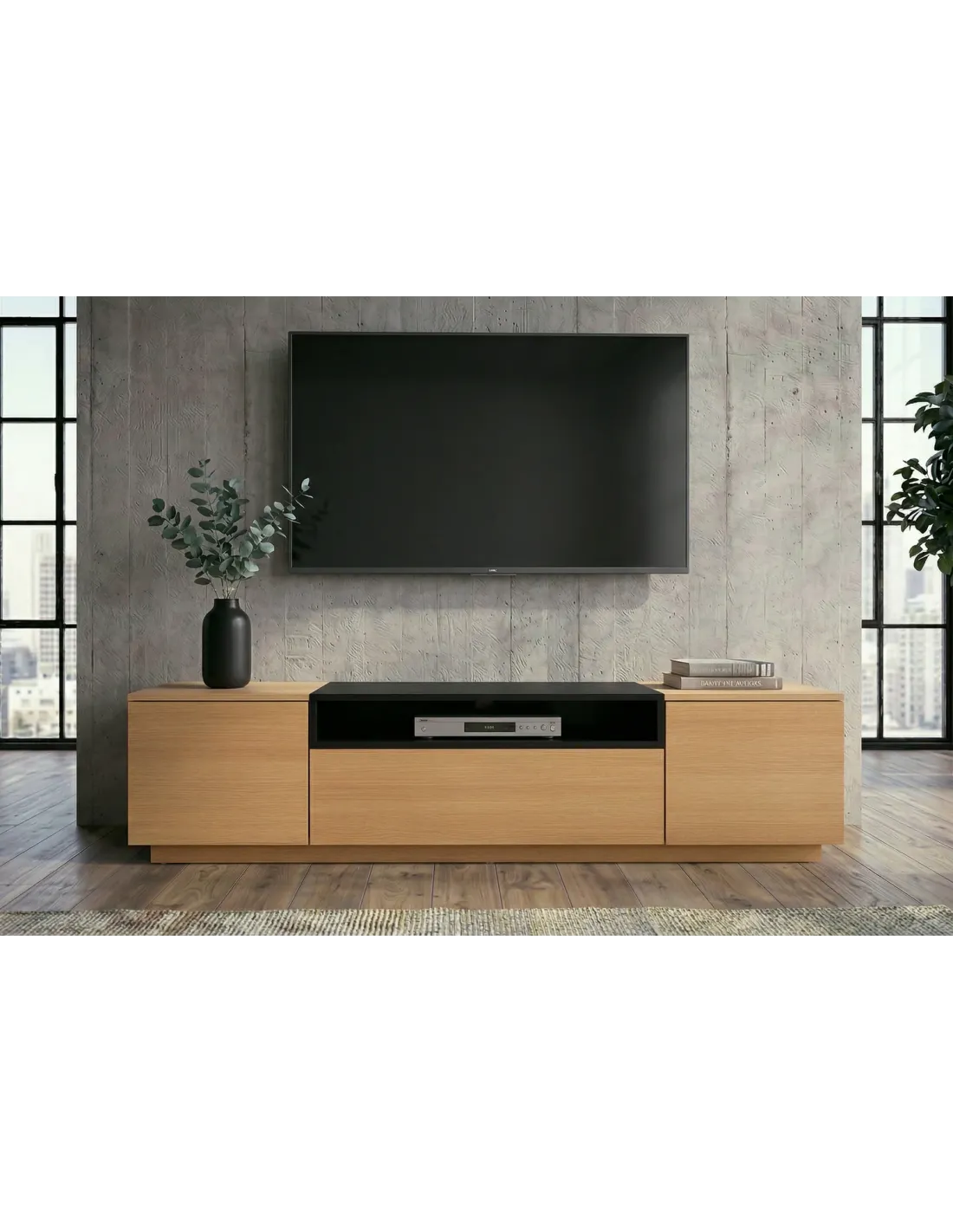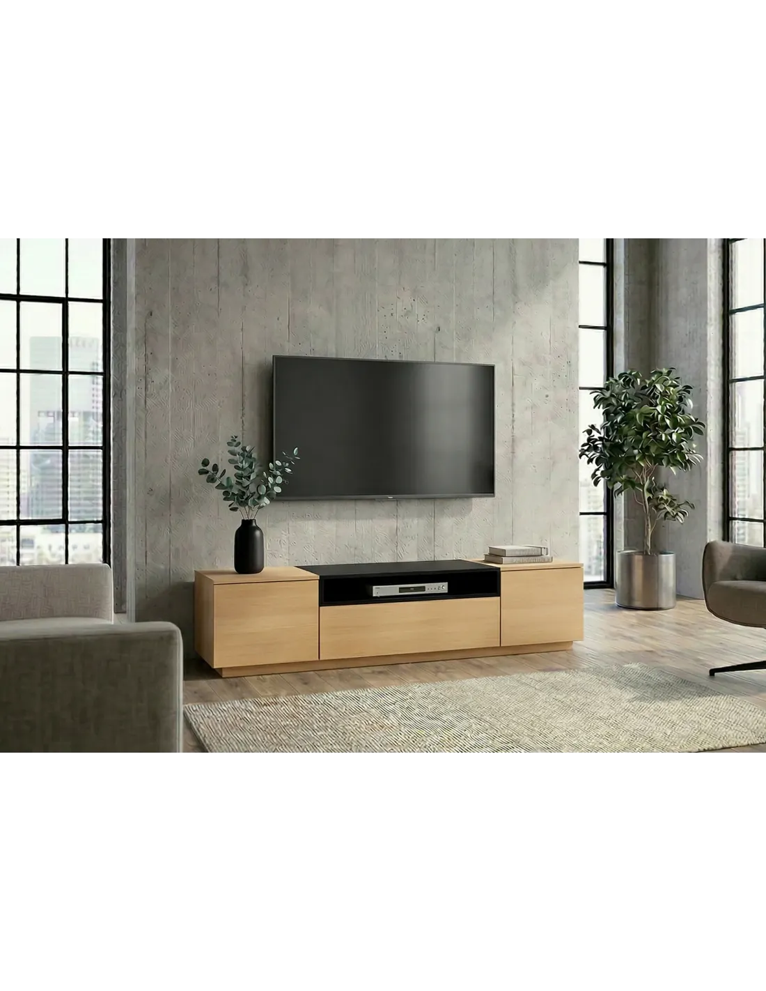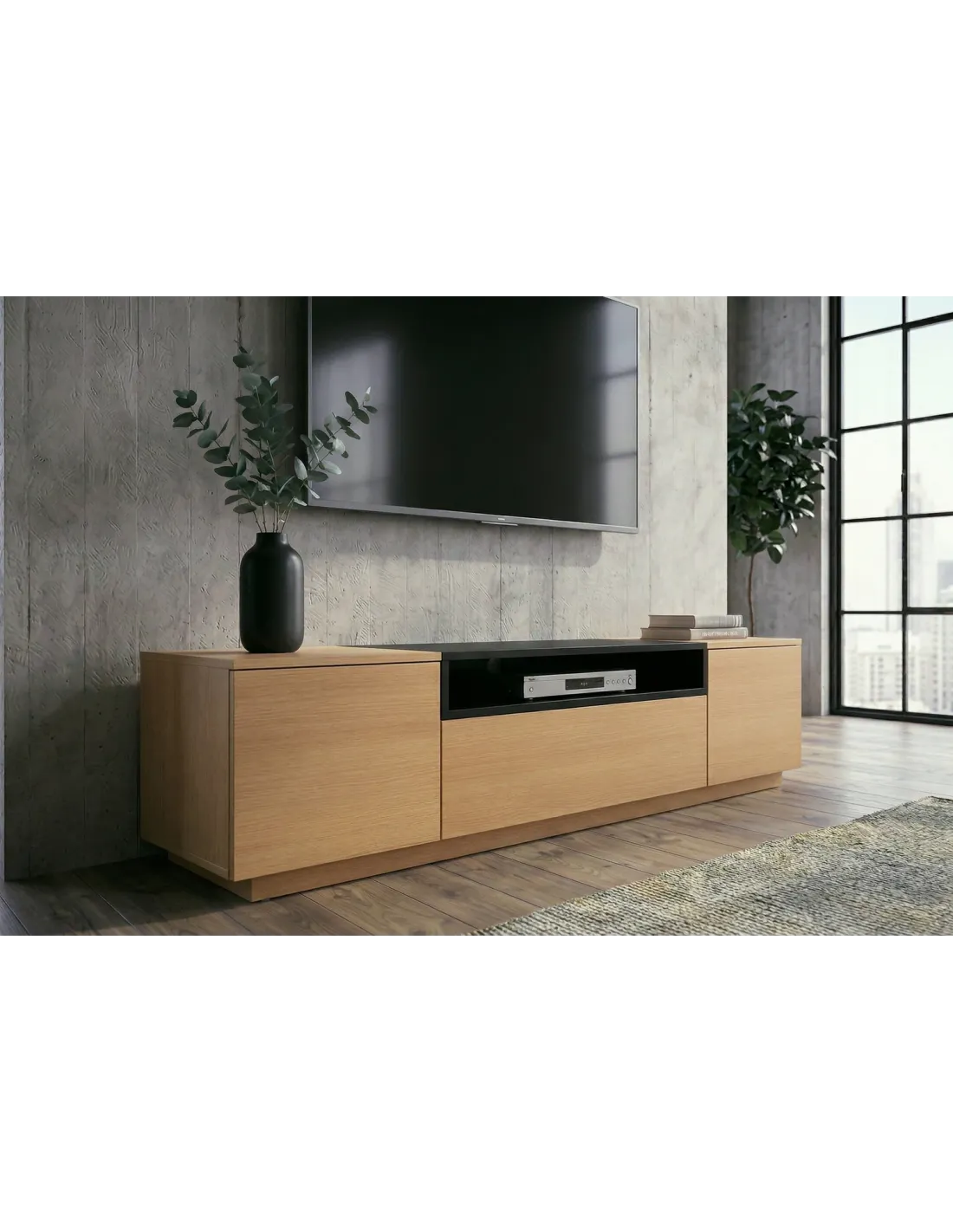 Ce meuble TV noir et bois naturel s'adapte à plusieurs styles d'intérieur :