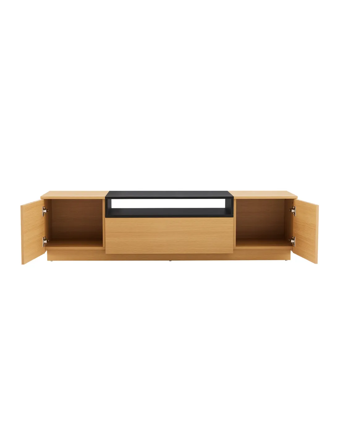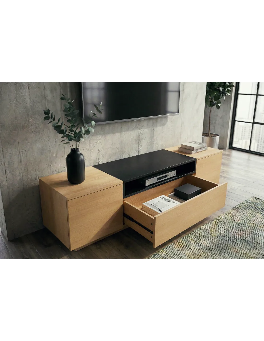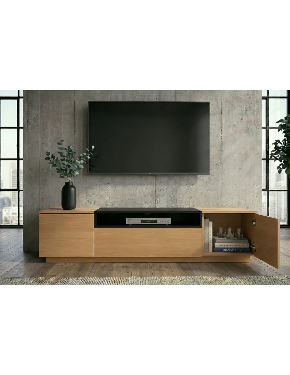 Ce meuble TV noir et bois naturel s'adapte à plusieurs styles d'intérieur :