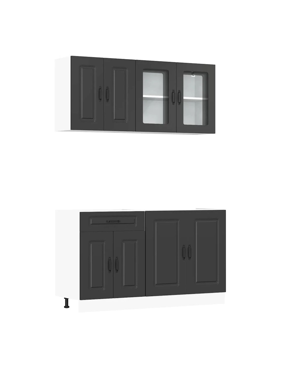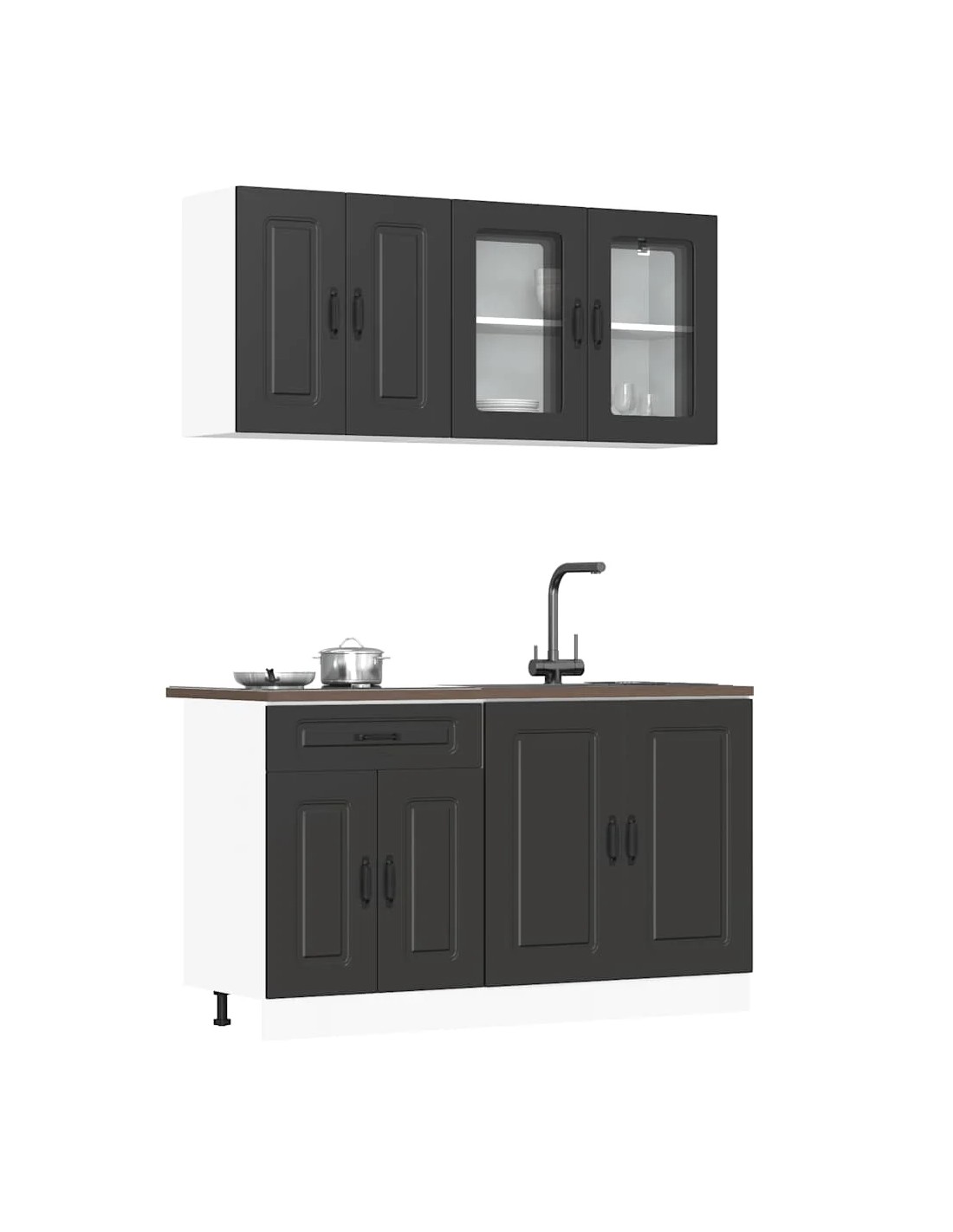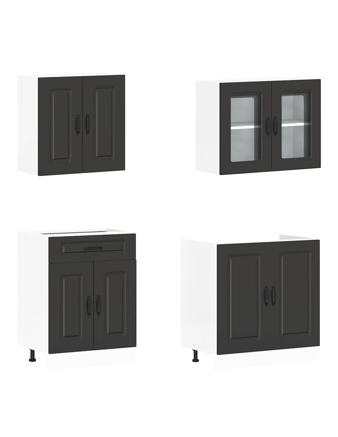 Cet ensemble de meubles de cuisine de 4 pièces, au design élégant, optimise votre espace de cuisine et offre un espace de rangement suffisant pour vos effets personnels ! Ces armoires sont durables et fonctionnelles, ce qui permet de mieux organiser votre cuisine. Elles offrent également suffisamment d’espace pour stocker des bols, des assiettes, des casseroles et d’autres appareils de cuisine. En outre, cet ensemble est facile à nettoyer avec un chiffon humide. Veuillez noter que le plan de travail, l'évier et le robinet ne sont pas inclus dans la livraison.
