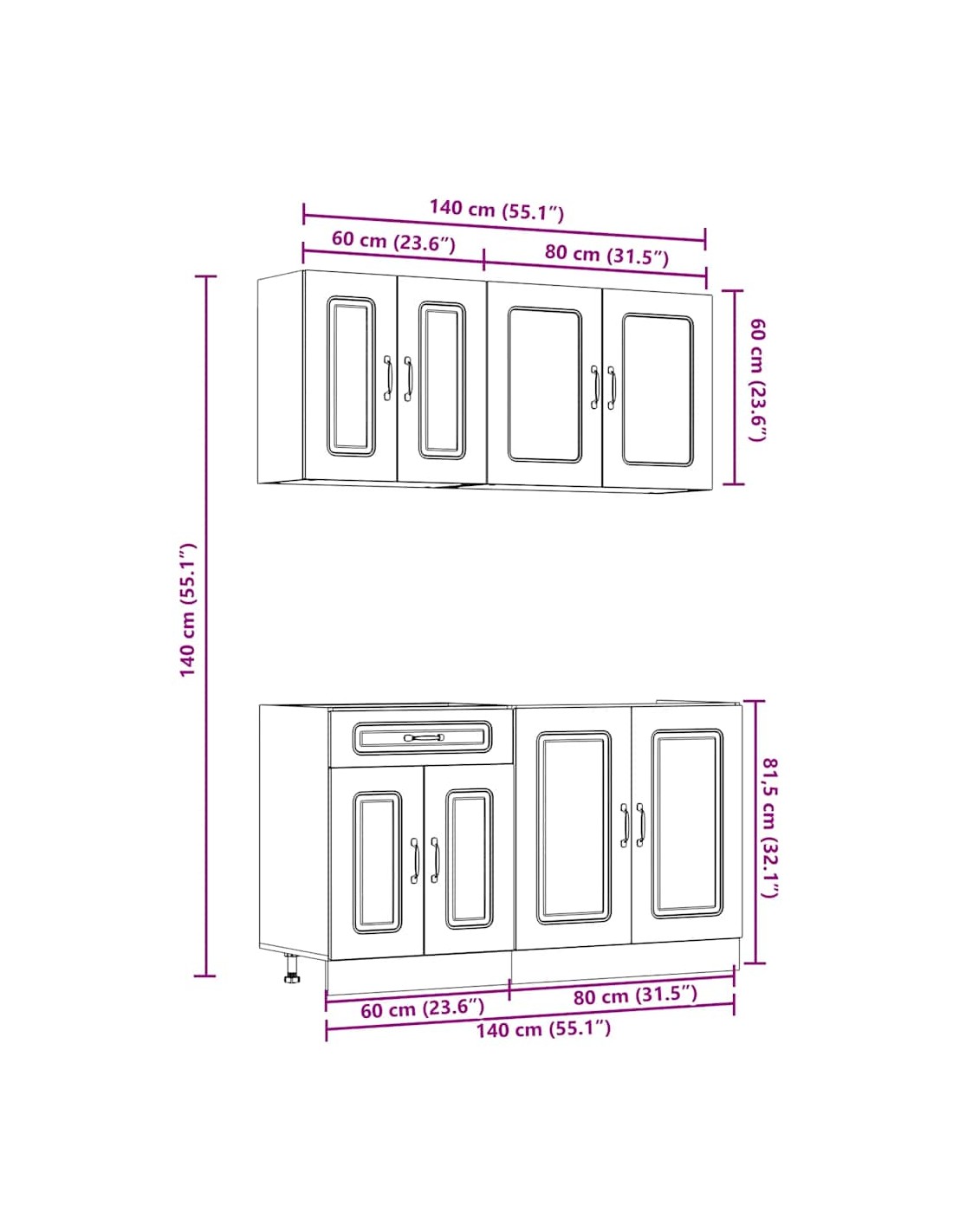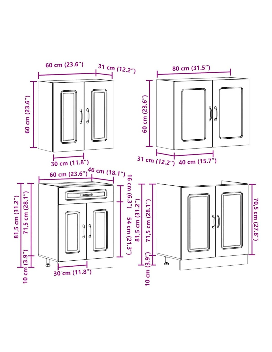 - 1 x Meuble de cuisine mural avec portes vitrées : 80 x 31 x 60 cm (l x P x H)
