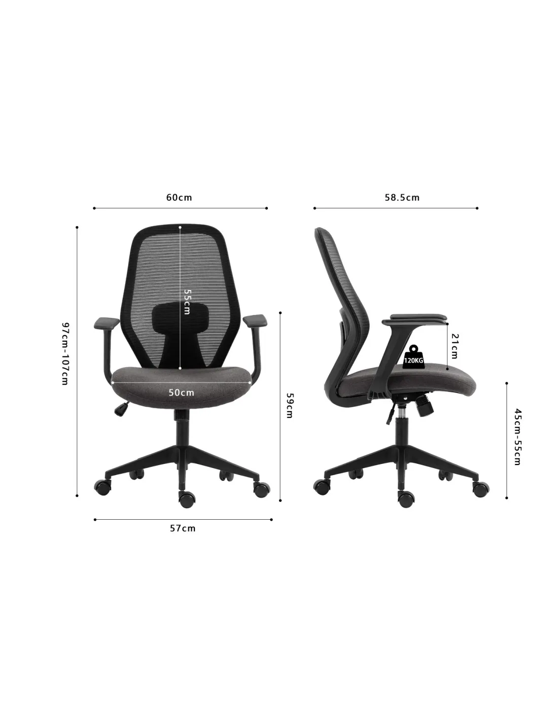 La chaise CLAUDE dispose d’une hauteur réglable de 97 à 107 cm, permettant une parfaite adaptation à votre bureau et à votre posture. Son assise de 60 x 58,5 cm est spacieuse et agréable, tandis que son dossier en mesh aéré favorise la circulation de l’air pour un confort optimal, même après plusieurs heures.