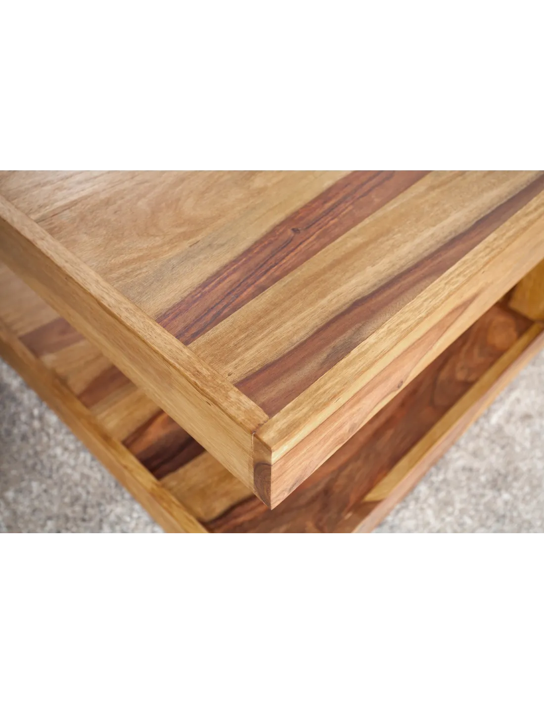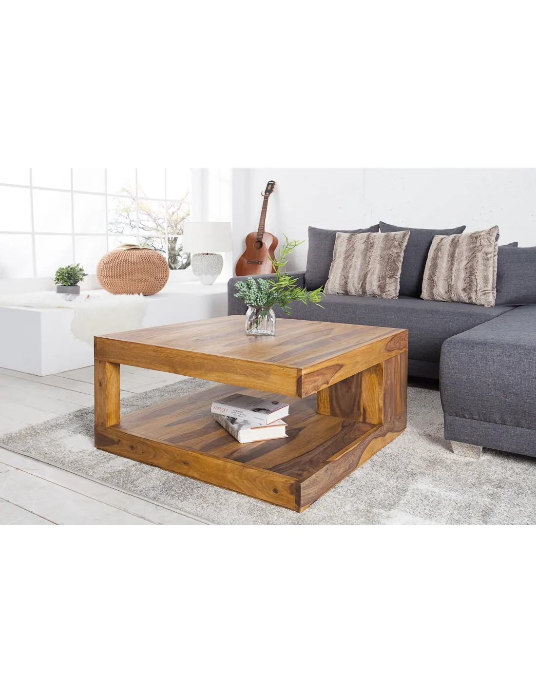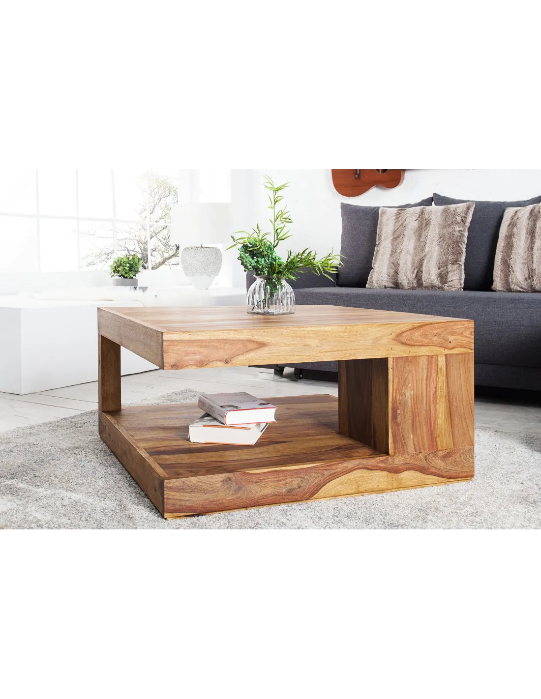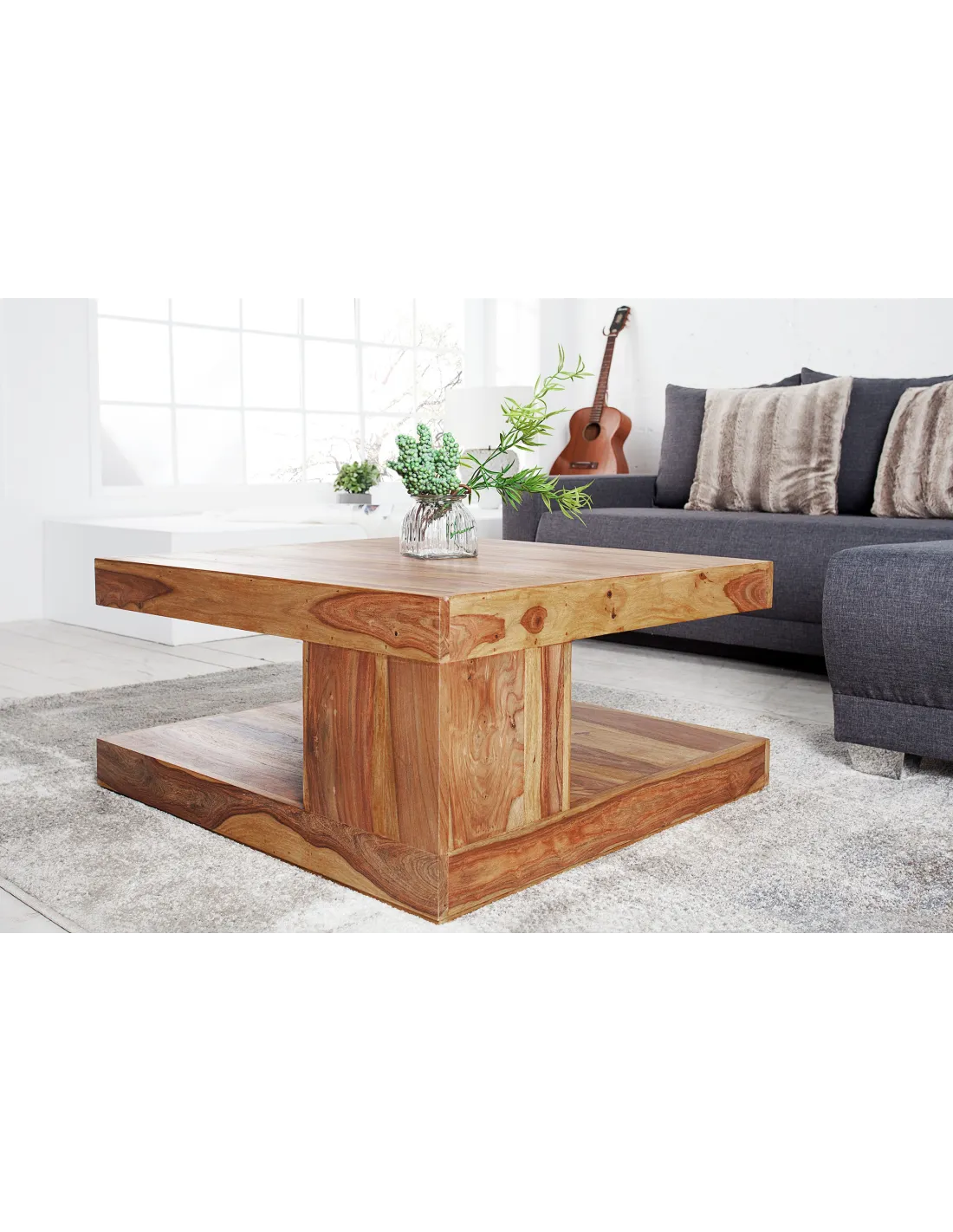 Cette table basse en bois massif de sheesham offre une grande solidité et une durabilité idéale pour un salon moderne.