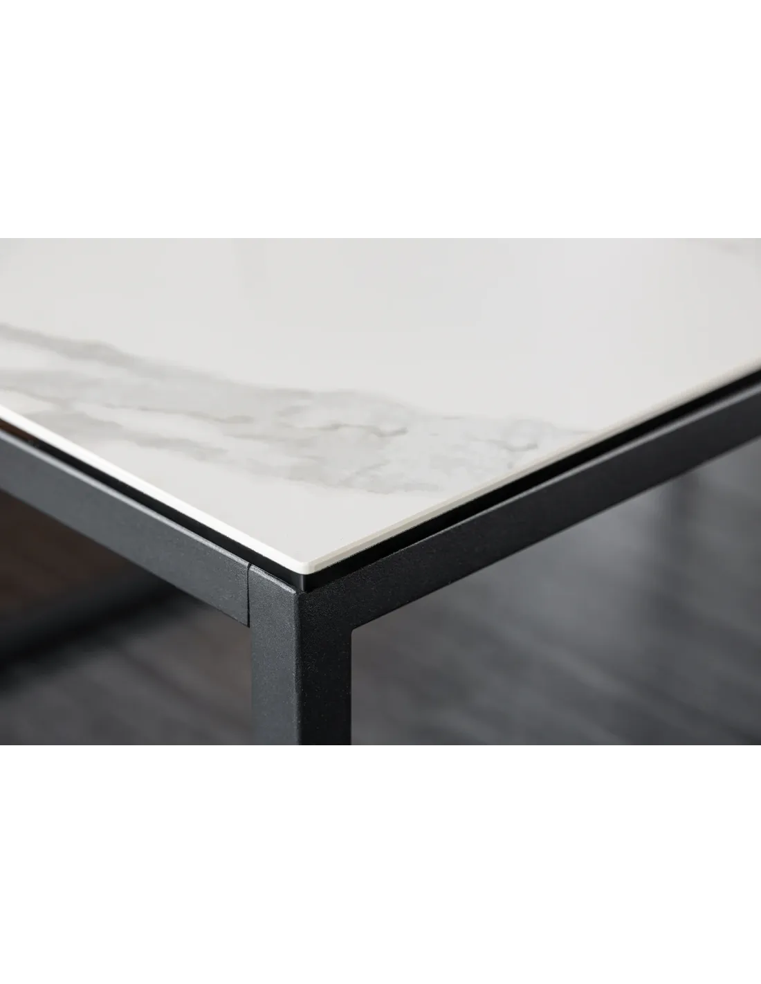Le plateau de la table SYMBIOSE associe la céramique effet marbre et le verre trempé, une combinaison aussi esthétique que résistante.