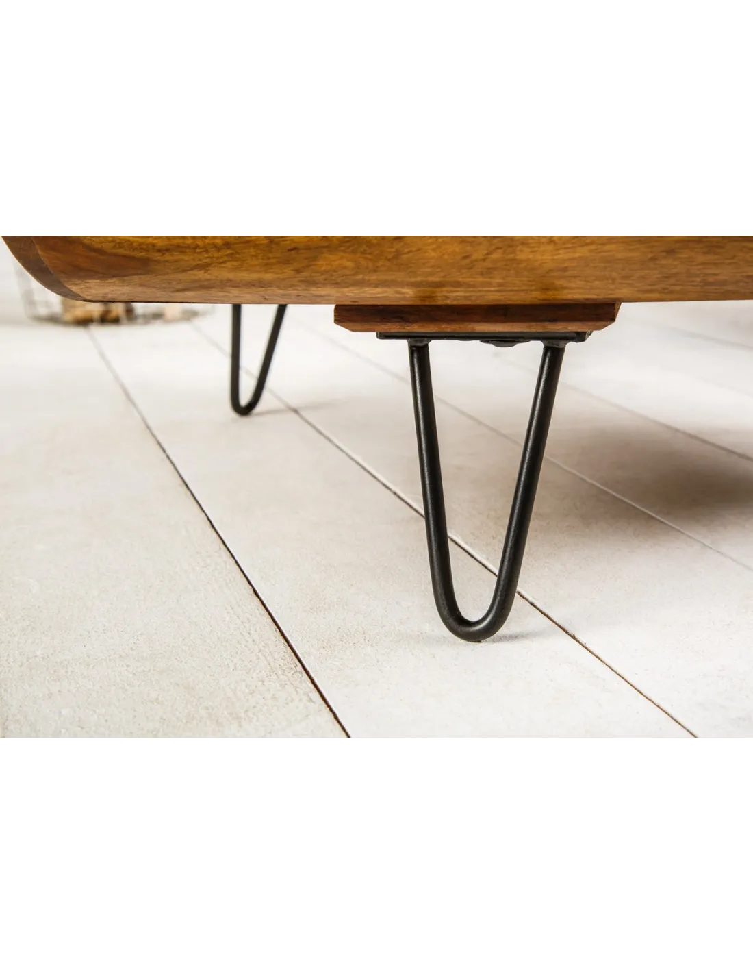 Fabriquée en bois de sheesham massif, reconnu pour sa solidité et ses teintes chaleureuses, la table est vernie afin de protéger la surface tout en conservant l’aspect naturel du bois. Les pieds en métal noir assurent une excellente stabilité et renforcent son look moderne.