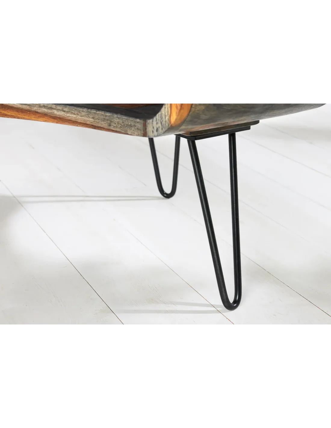 L’association du bois massif et des pieds en métal noir crée un contraste moderne qui s’intègre parfaitement dans un intérieur contemporain, industriel ou bohème chic. Que ce soit pour accompagner vos moments de détente ou recevoir vos invités, cette table basse s’impose comme un élément central du salon.