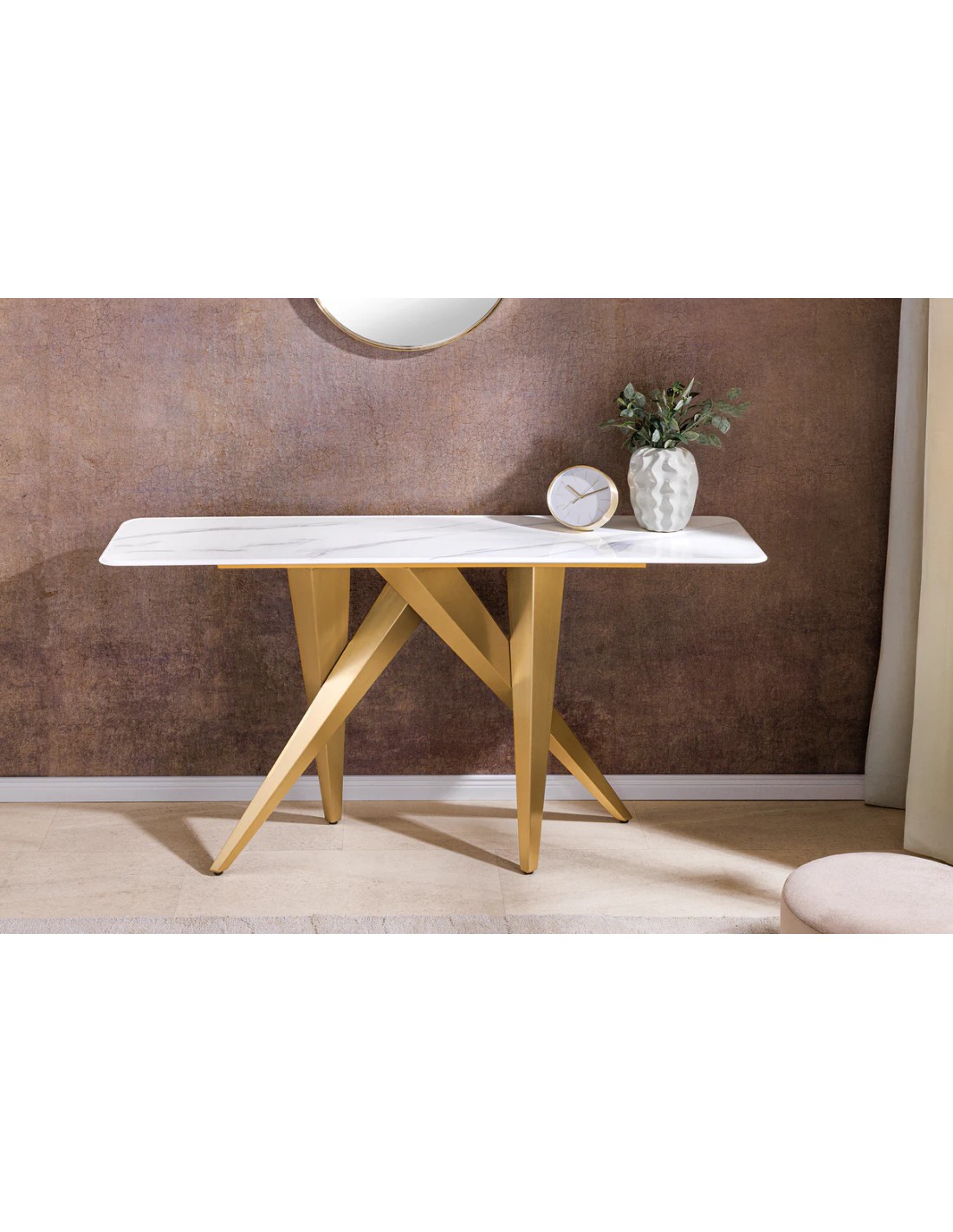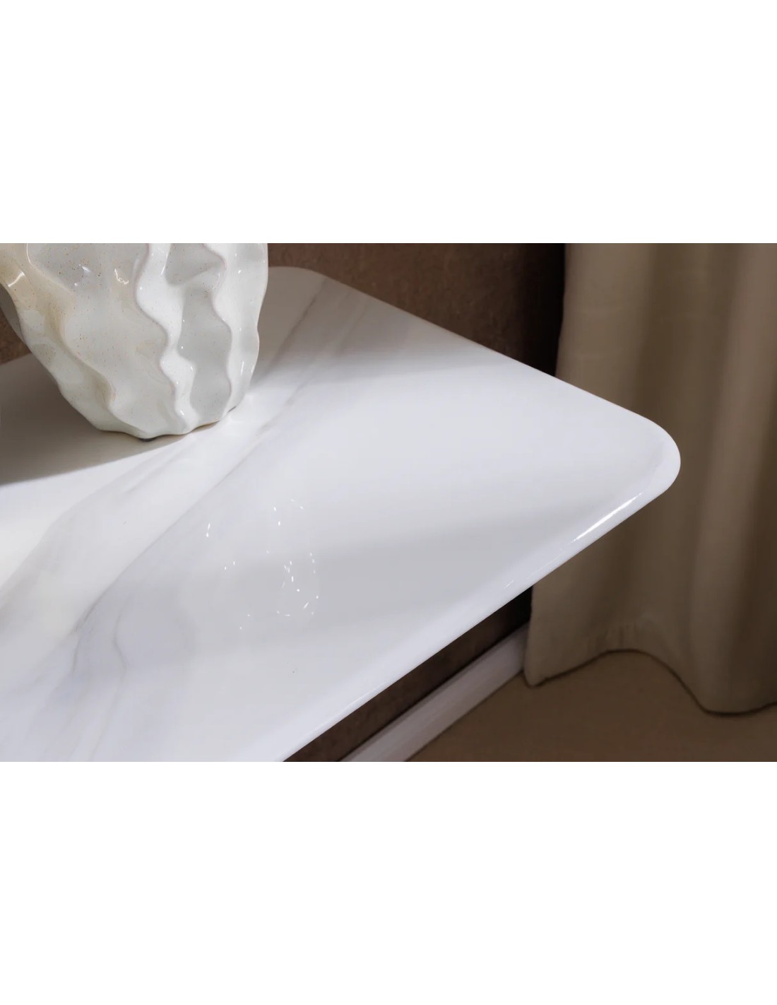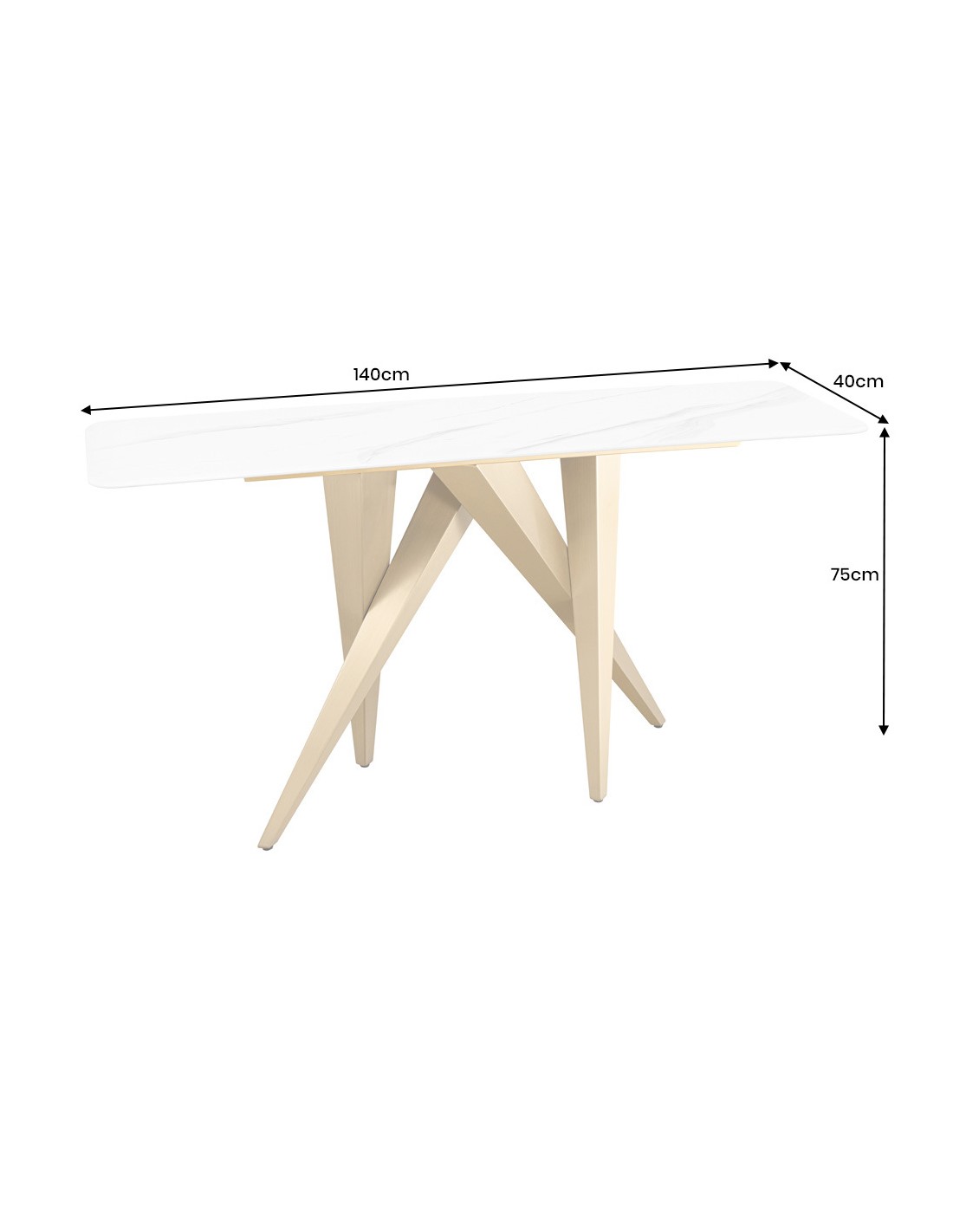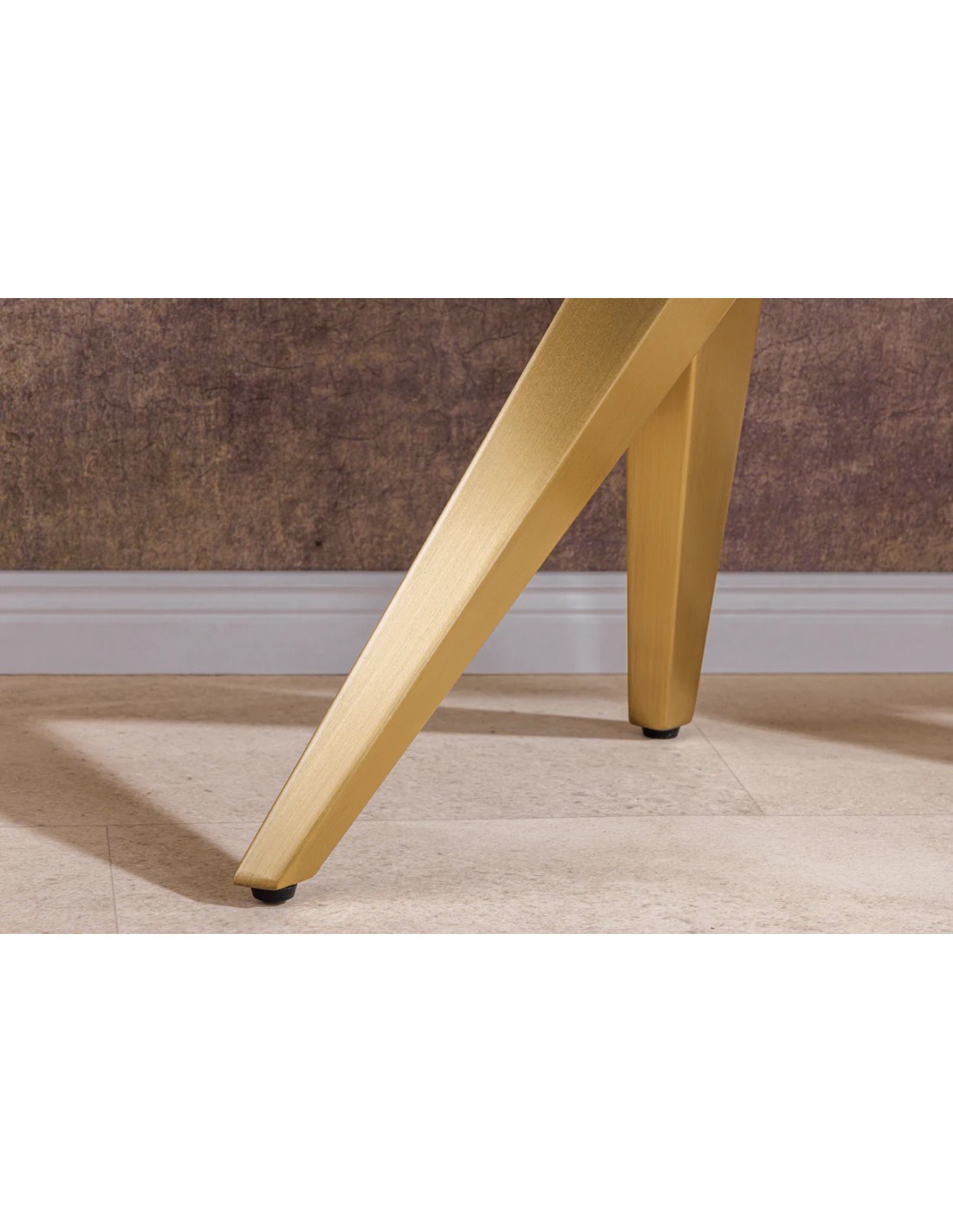 Son plateau en céramique effet marbre blanc reflète la pureté et la lumière, tandis que son piétement métallique brossé couleur champagne doré ajoute une note de glamour discret.