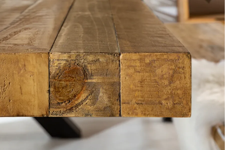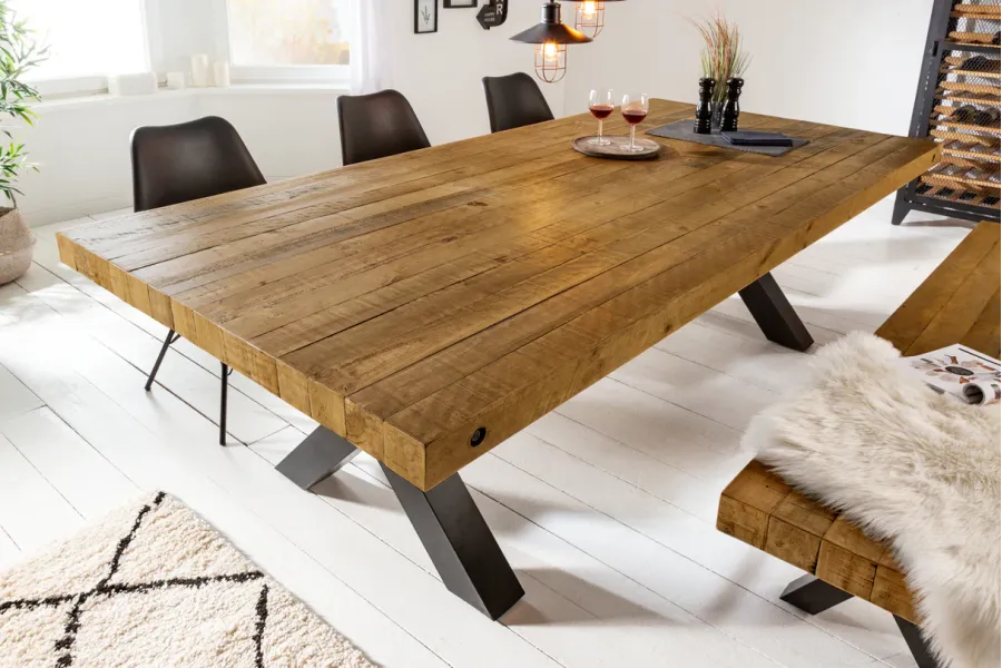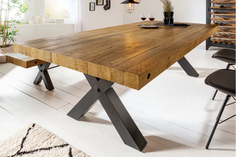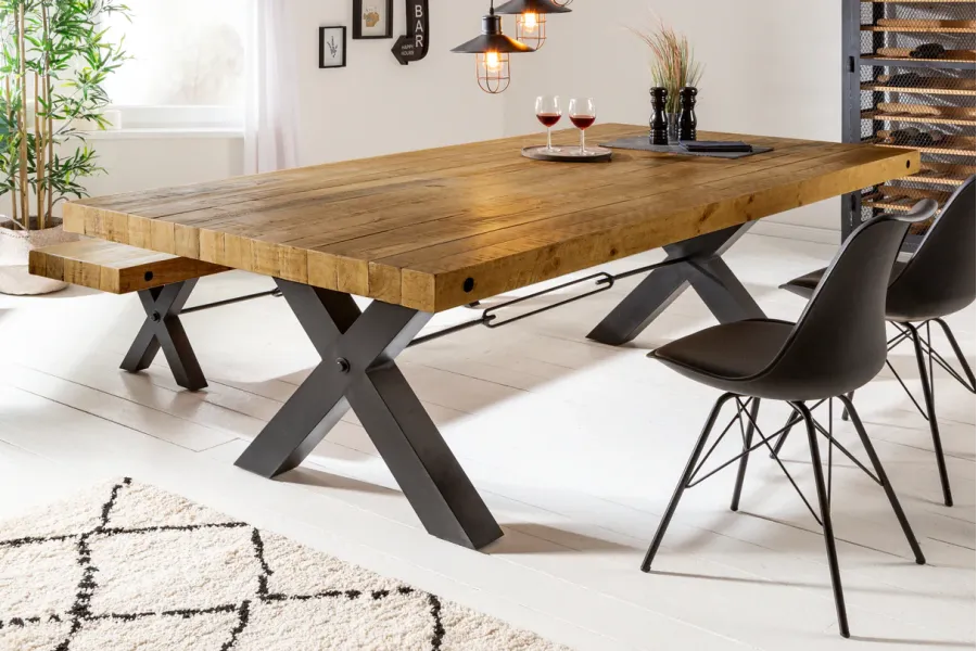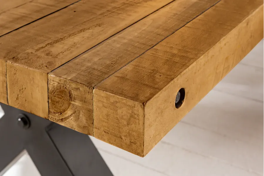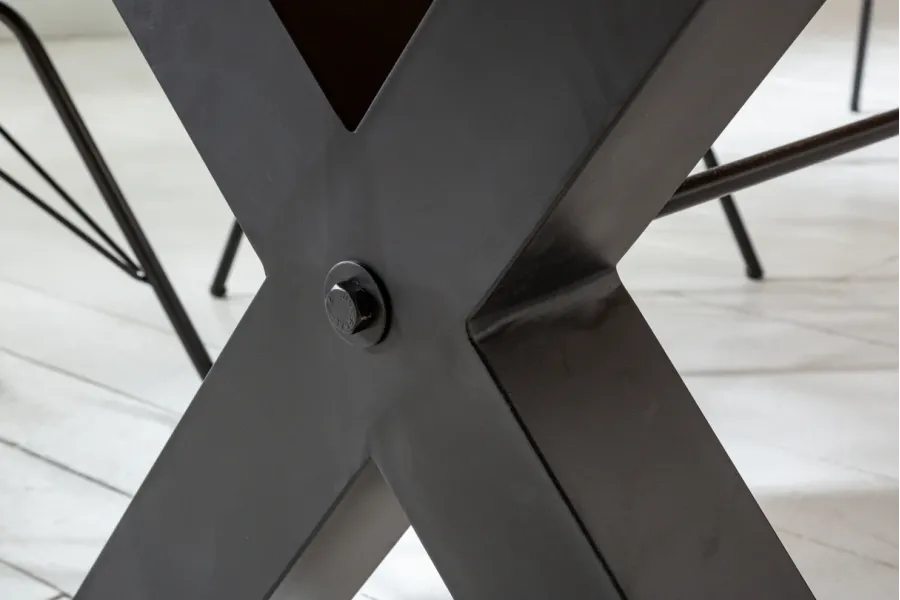 Les pieds en X en métal noir revêtu de poudre garantissent une stabilité exceptionnelle et un style résolument industriel. Conçue pour durer, la table THOR supporte jusqu’à 120 kg de charge grâce à son plateau épais de 8 cm, assurant ainsi une robustesse à toute épreuve.