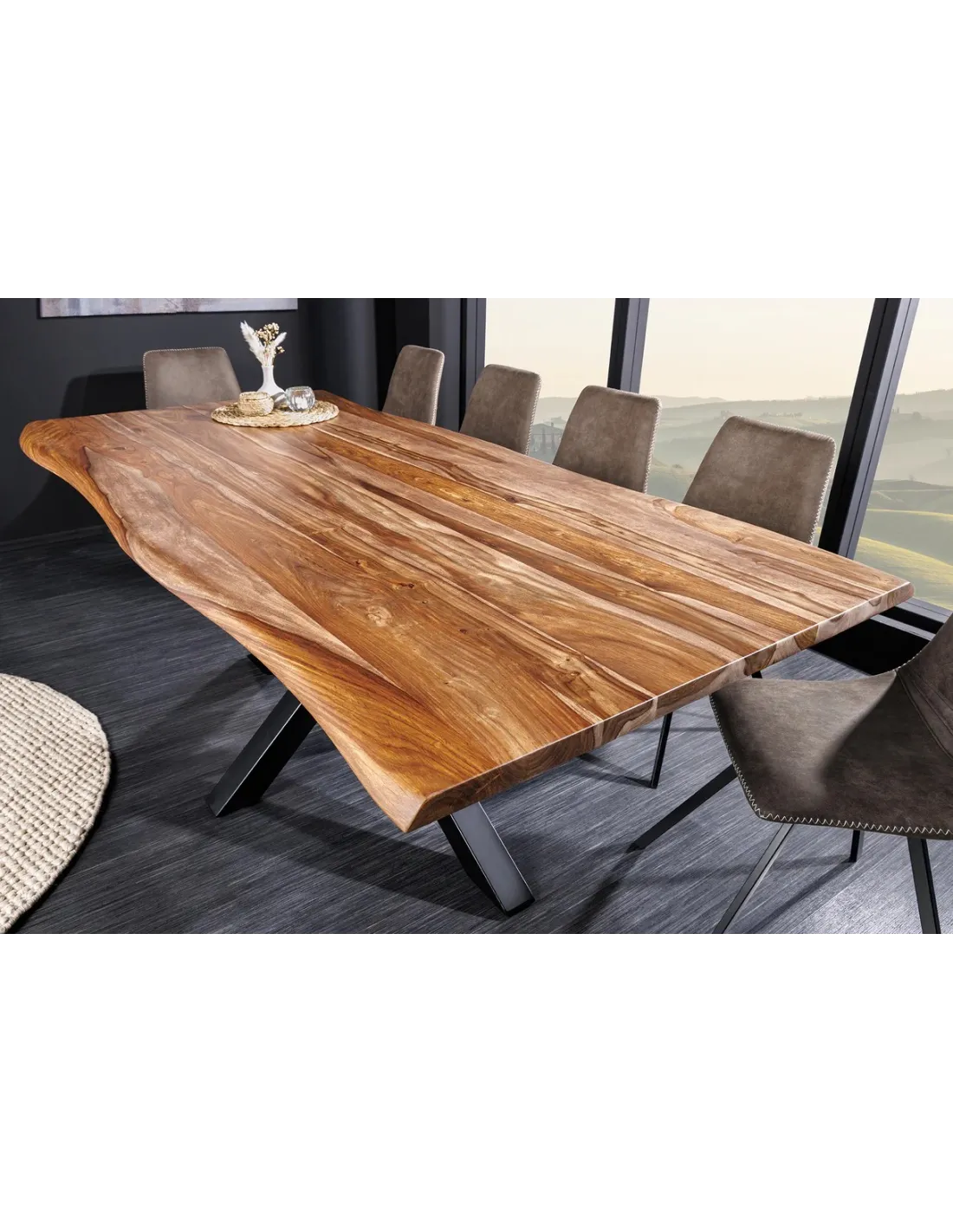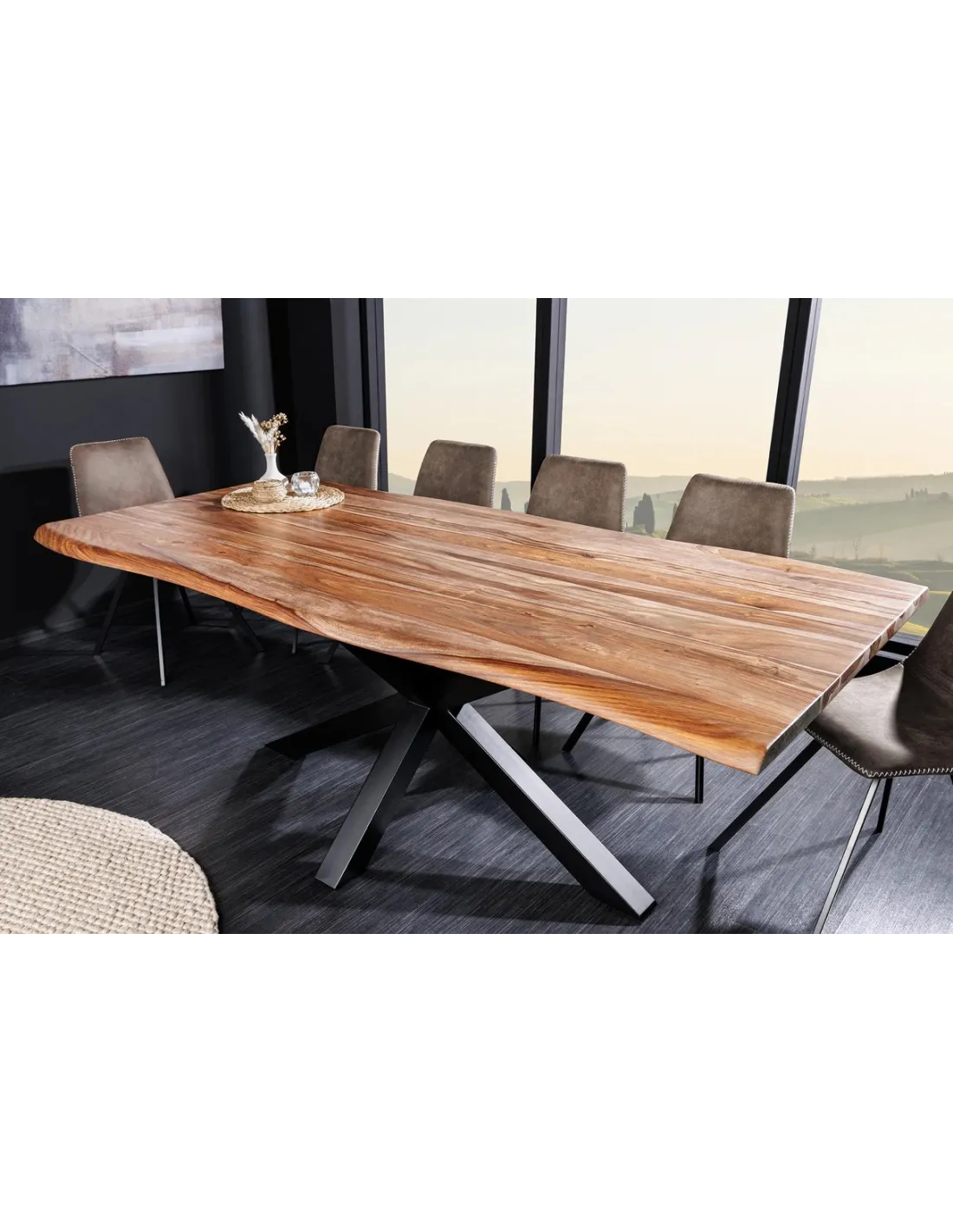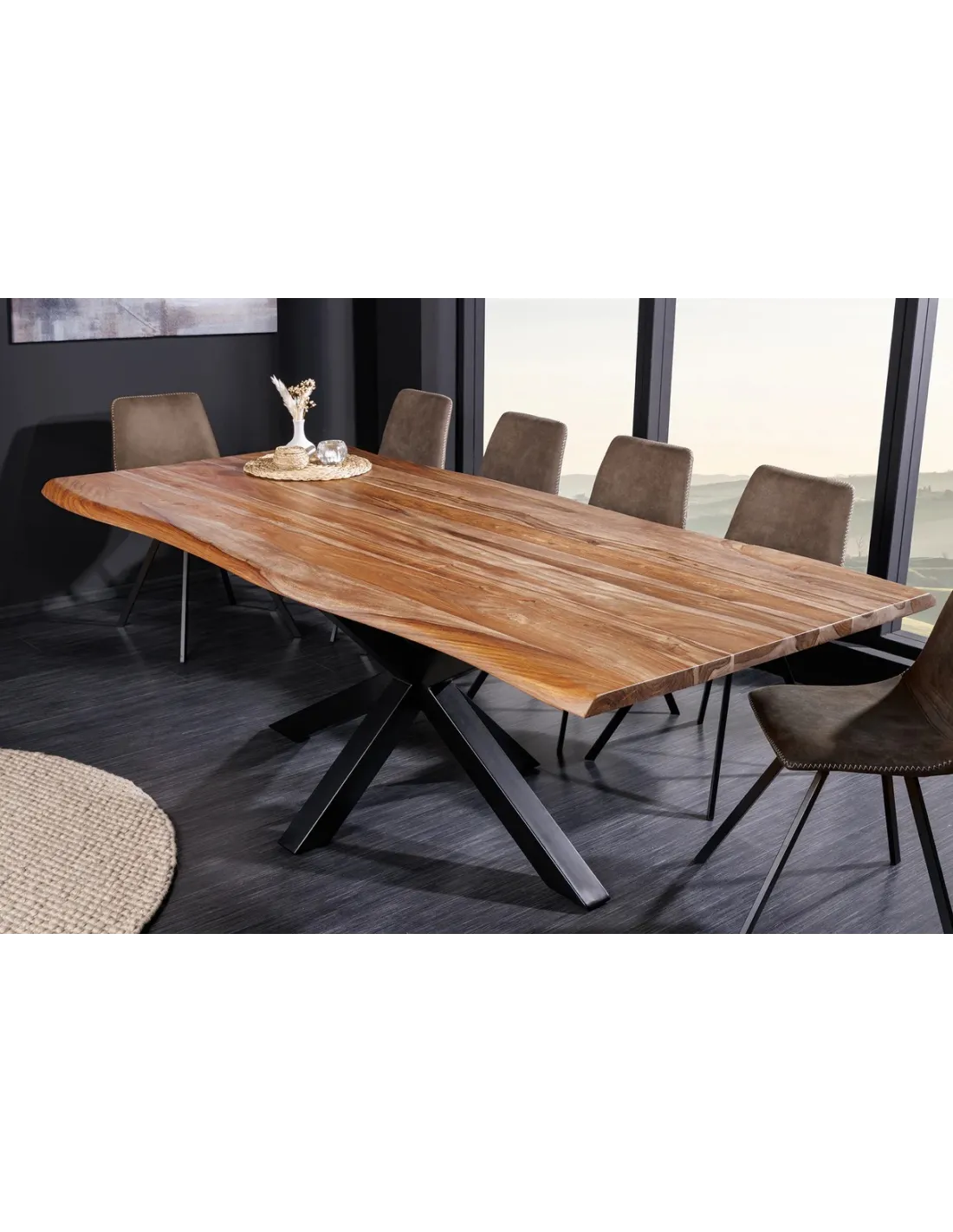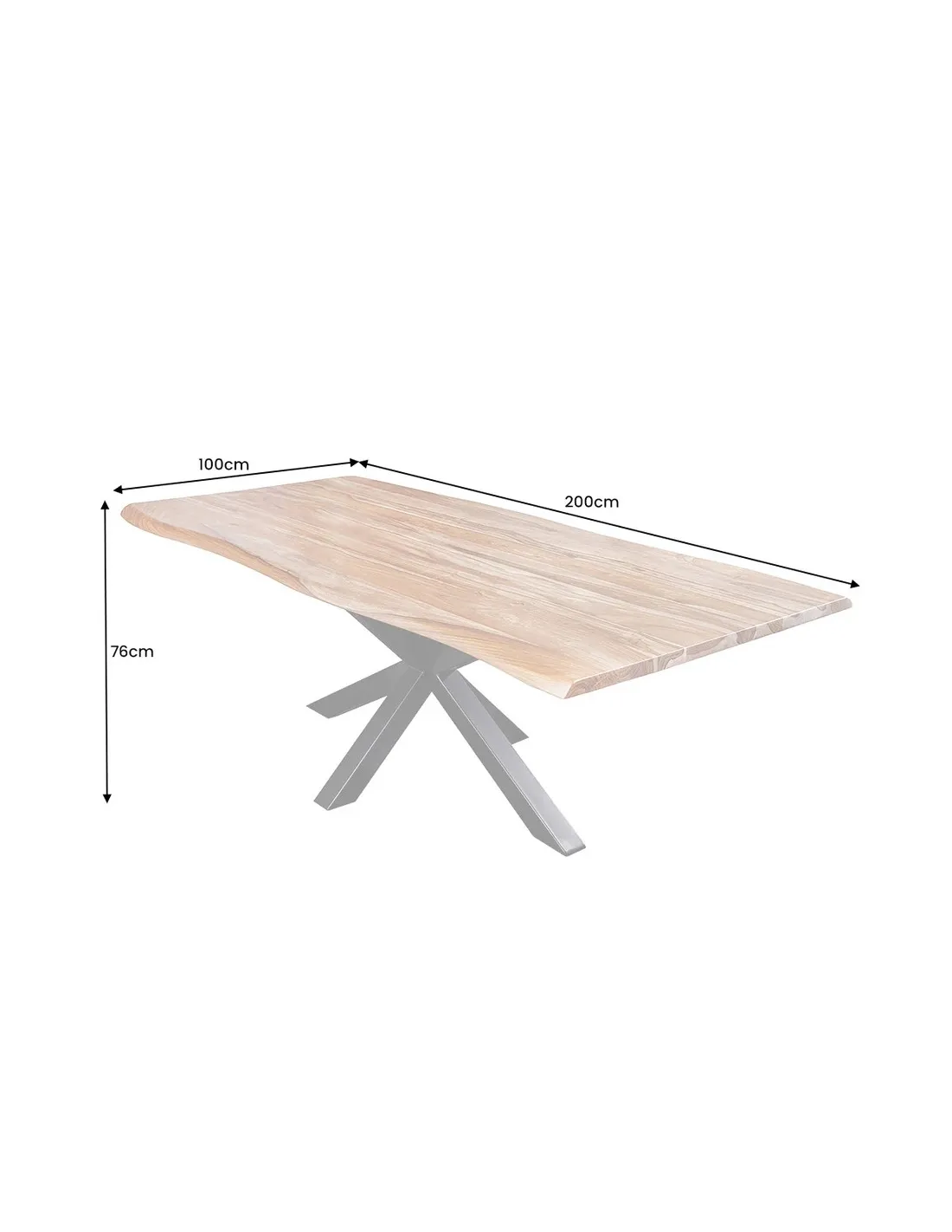 Le point d'orgue de son design réside dans son cadre métallique en forme d'étoile. Cette structure en fer poudré noir assure non seulement une stabilité exceptionnelle, mais libère également de l'espace pour les jambes de vos convives, permettant d'entourer la table sans contrainte. Avec ses 200 cm de longueur, elle devient le cœur battant de votre maison, alliant parfaitement l'esprit loft industriel et la noblesse du bois brut.
