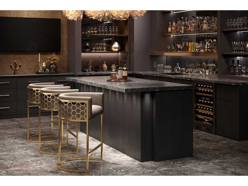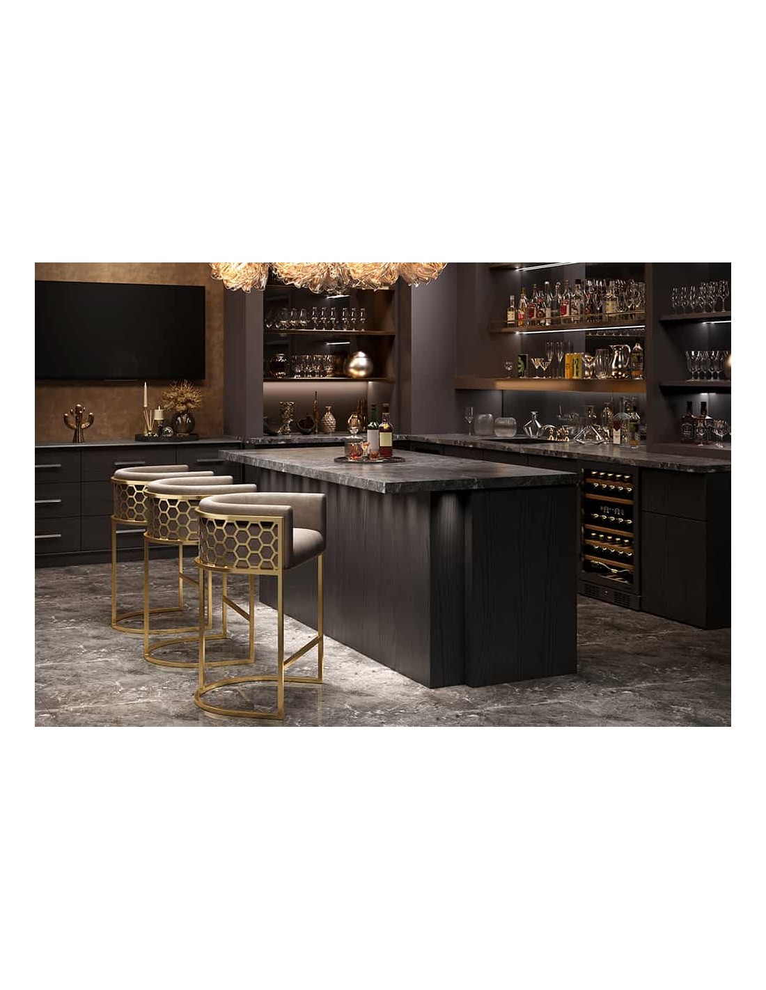 Ce mariage de tons neutres et dorés s’intègre aussi bien dans une cuisine moderne que dans un bar design ou une salle à manger élégante.