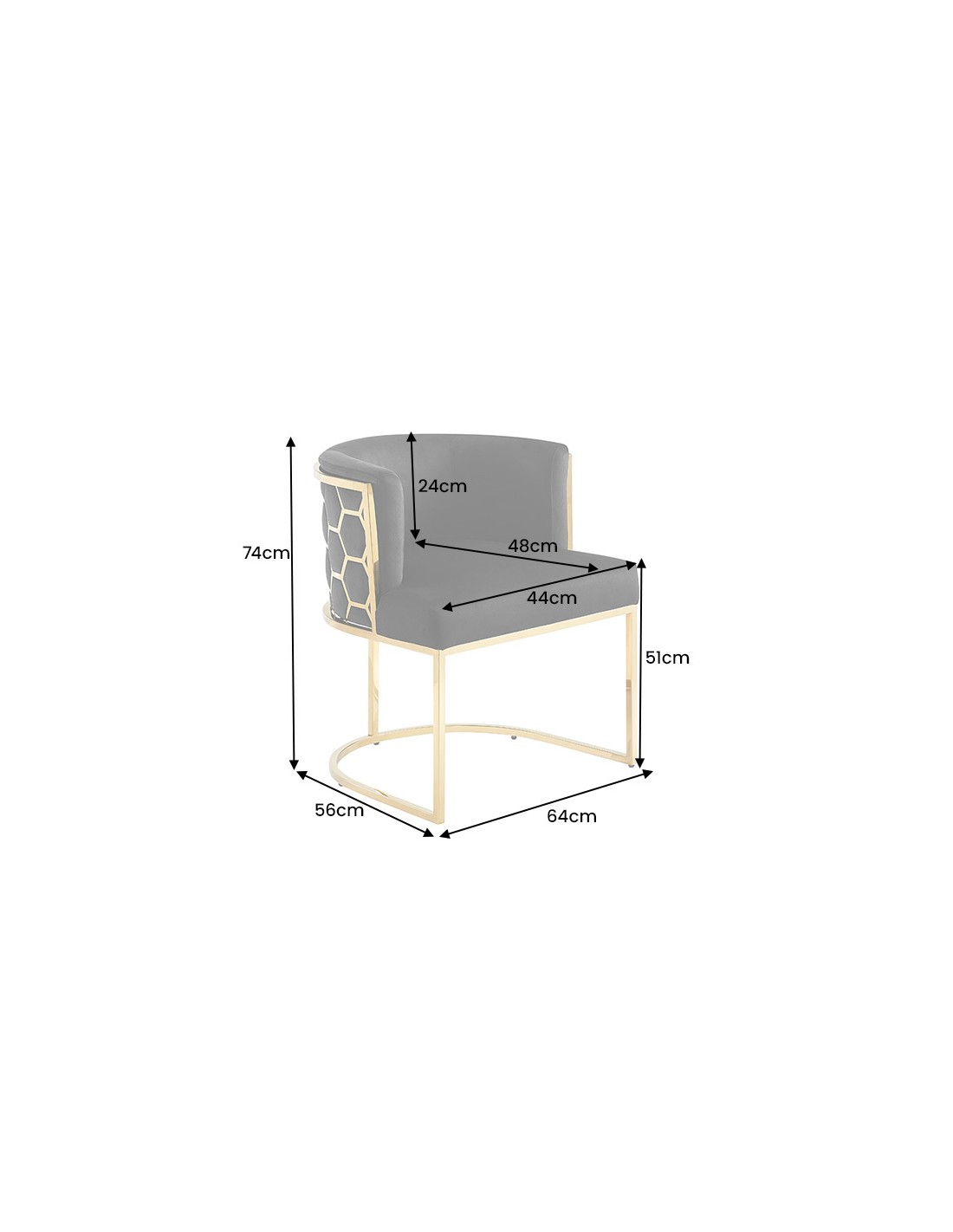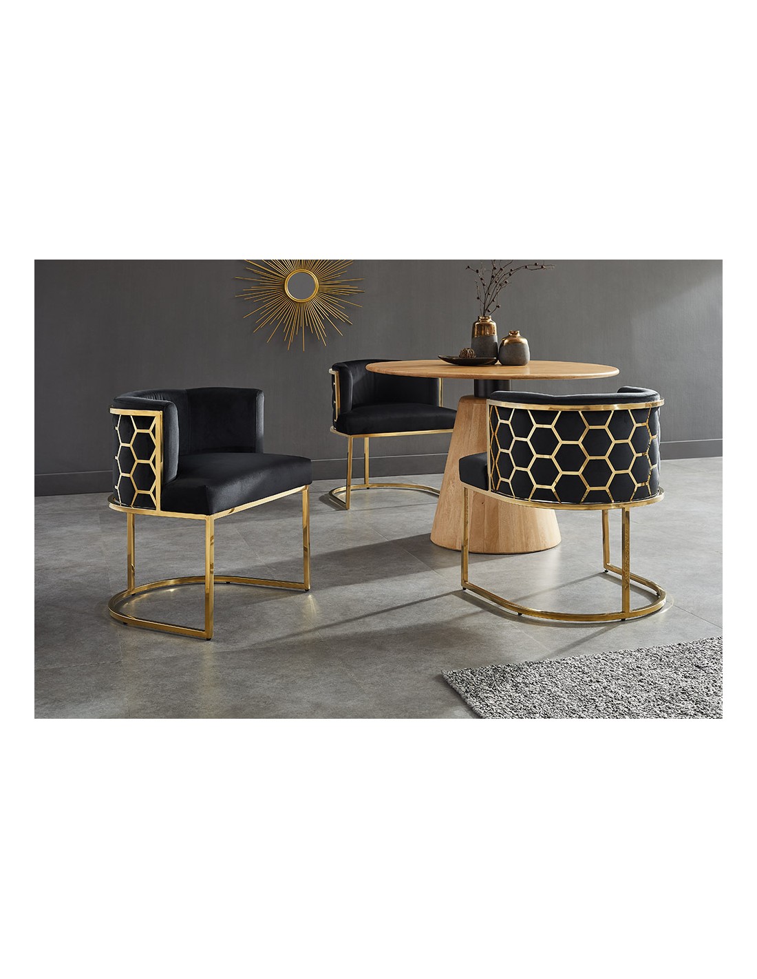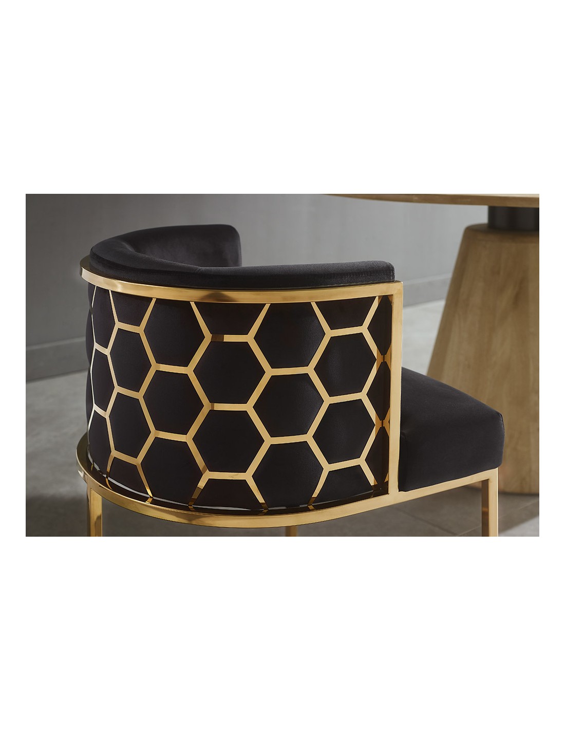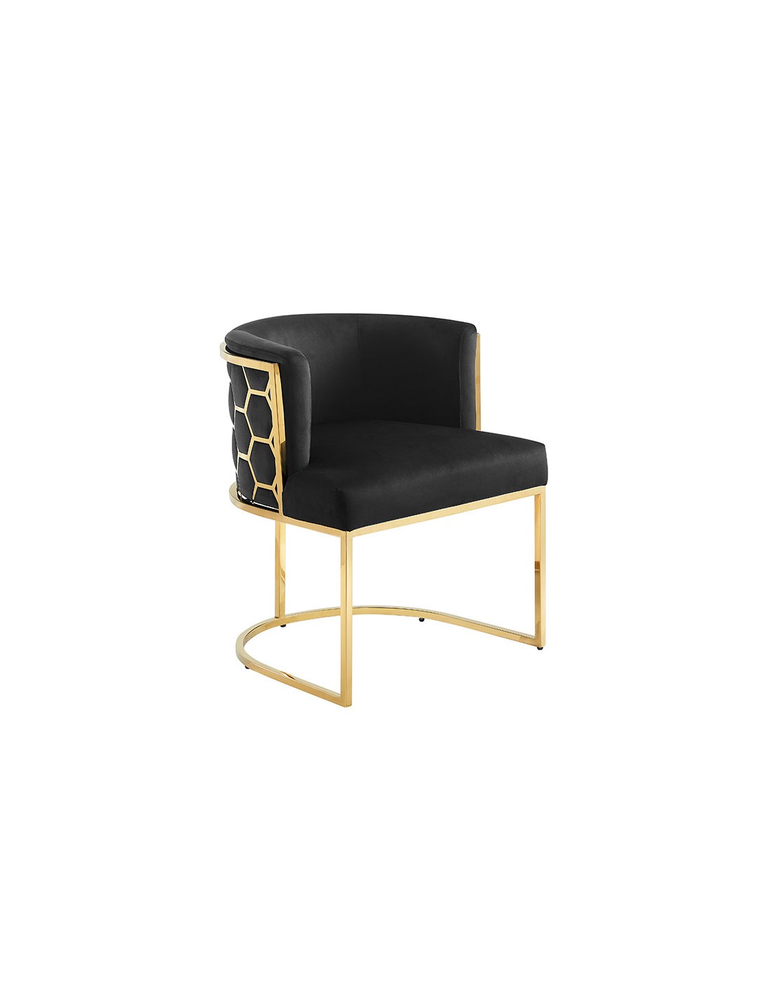 Sa structure en acier inoxydable doré reflète la lumière avec subtilité, tandis que le velours noir 100 % polyester apporte une touche chaleureuse et luxueuse.